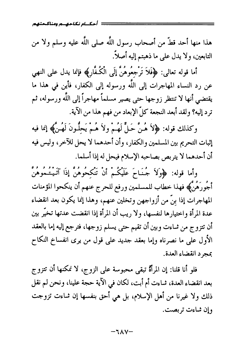 أَمَّا قَوْلُهُ تَعَالَى: {فَلَا تَرْجِعُوهُنَّ إِلَى الْكُفَّارِ} [الممتحنة: 10] فَإِنَّمَا يَدُلُّ عَلَى النَّهْيِ عَنْ رَدِّ النِّسَاءِ الْمُهَاجِرَاتِ إِلَى اللَّهِ وَرَسُولِهِ إِلَى الْكُفَّارِ، فَأَيْنَ فِي هَذَا مَا يَقْتَضِي أَنَّهَا لَا تَنْتَظِرُ زَوْجَهَا حَتَّى يَصِيرَ مُسْلِمًا مُهَاجِرًا إِلَى اللَّهِ وَرَسُولِهِ، ثُمَّ تُرَدُّ إِلَيْهِ؟ وَلَقَدْ أَبْعَدَ النُّجْعَةَ كُلَّ الْإِبْعَادِ مَنْ فَهِمَ هَذَا مِنَ الْآيَةِ.