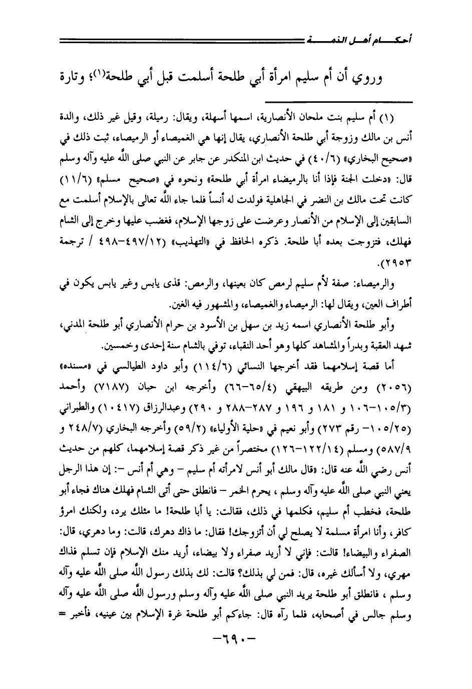 وَرُوِيَ أَنَّ أُمَّ سُلَيْمٍ امْرَأَةِ أَبِي طَلْحَةَ أَسْلَمَتْ قَبْلَ أَبِي طَلْحَةَ، وَتَارَةً