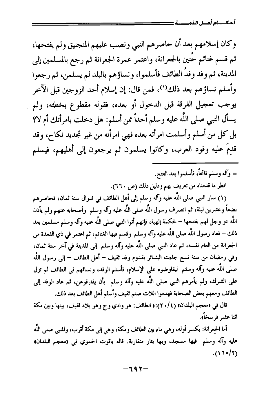 وَكَانَ إِسْلَامُهُمْ بَعْدَ أَنْ حَاصَرَهُمُ النَّبِيُّ - صَلَّى اللَّهُ عَلَيْهِ وَسَلَّمَ - وَنَصَبَ عَلَيْهِمُ الْمَنْجَنِيقَ، وَلَمْ يَفْتَحْهَا، ثُمَّ قَسَّمَ غَنَائِمَ حُنَيْنٍ بِالْجِعِرَّانَةِ، وَاعْتَمَرَ عُمْرَةَ الْجِعِرَّانَةِ، ثُمَّ رَجَعَ بِالْمُسْلِمِينَ إِلَى الْمَدِينَةِ، ثُمَّ وَفَدَ وَفْدُ الطَّائِفِ فَأَسْلَمُوا، وَنِسَاؤُهُمْ بِالْبَلَدِ لَمْ يُسْلِمْنَ، ثُمَّ رَجَعُوا، وَأَسْلَمَ نِسَاؤُهُمْ بَعْدَ ذَلِكَ، فَمَنْ قَالَ: إِنَّ إِسْلَامَ أَحَدِ الزَّوْجَيْنِ قَبْلَ الْآخَرِ يُوجِبُ تَعْجِيلَ الْفُرْقَةِ قَبْلَ الدُّخُولِ أَوْ بَعْدَهُ، فَقَوْلُهُ مَقْطُوعٌ بِخَطَئِهِ، وَلَمْ يَسْأَلِ النَّبِيُّ - صَلَّى اللَّهُ عَلَيْهِ وَسَلَّمَ - أَحَدًا مِمَّنْ أَسْلَمَ: هَلْ دَخَلْتَ بِامْرَأَتِكَ أَمْ لَا؟ بَلْ كُلُّ مَنْ أَسْلَمَ، وَأَسْلَمَتِ امْرَأَتُهُ بَعْدَهُ فَهِيَ امْرَأَتُهُ مِنْ غَيْرِ تَجْدِيدِ نِكَاحٍ، وَقَدْ قَدِمَ عَلَيْهِ وُفُودُ الْعَرَبِ، وَكَانُوا يُسْلِمُونَ، ثُمَّ يَرْجِعُونَ إِلَى أَهْلِيهِمْ، فَيُسْلِمُ