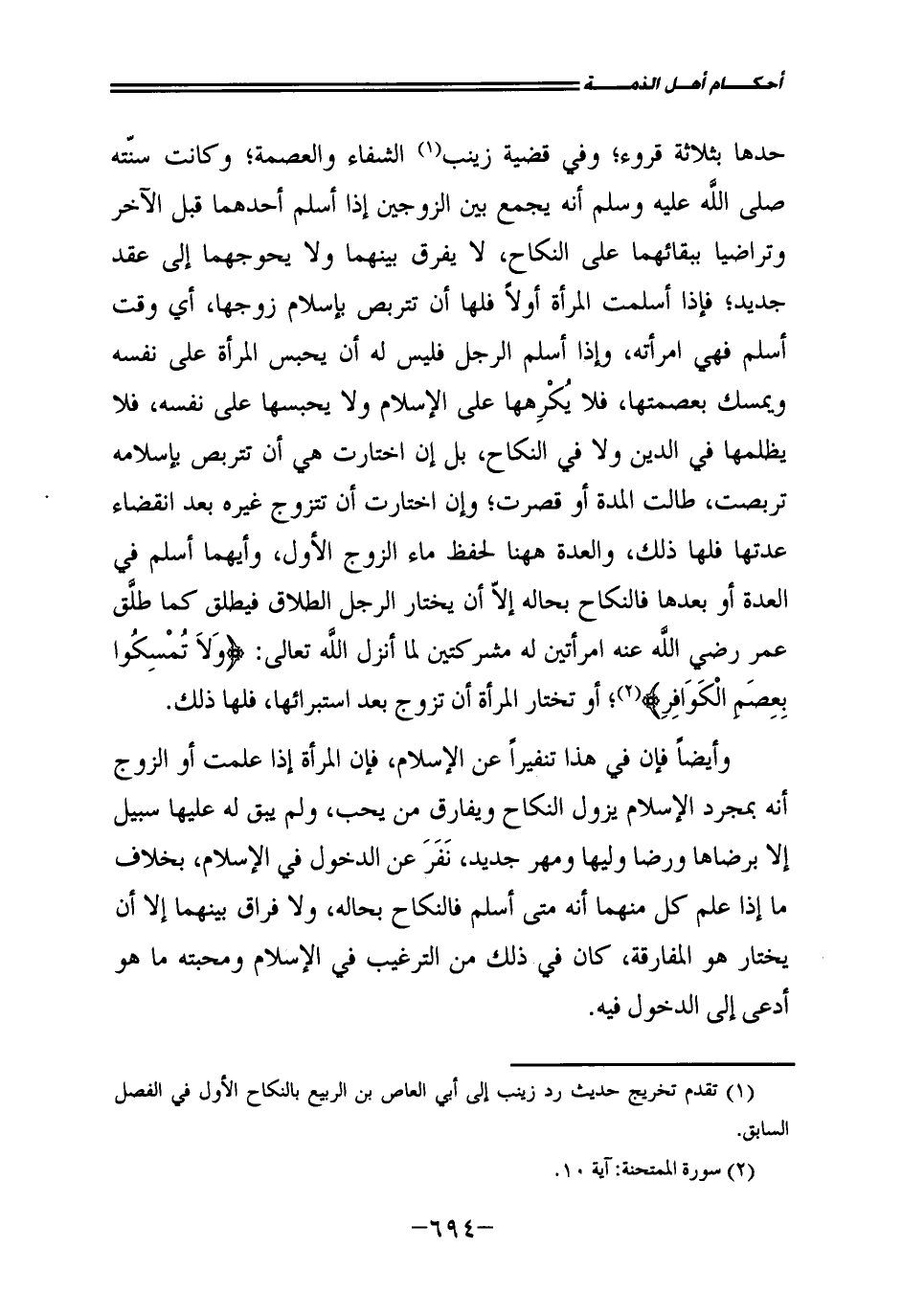 حَدَّهَا بِثَلَاثَةِ قُرُوءٍ، وَفِي قَضِيَّةِ زَيْنَبَ الشِّفَاءُ وَالْعِصْمَةُ، وَكَانَتْ سُنَّتُهُ - صَلَّى اللَّهُ عَلَيْهِ وَسَلَّمَ - أَنَّهُ يَجْمَعُ بَيْنَ الزَّوْجَيْنِ إِذَا أَسْلَمَ أَحَدُهُمَا قَبْلَ الْآخَرِ، وَتَرَاضَيَا بِبَقَائِهِمَا عَلَى النِّكَاحِ لَا يُفَرِّقُ بَيْنَهُمَا، وَلَا يُحْوِجُهُمَا إِلَى عَقْدٍ جَدِيدٍ، فَإِذَا أَسْلَمَتِ الْمَرْأَةُ أَوَّلًا فَلَهَا أَنْ تَتَرَبَّصَ بِإِسْلَامِ زَوْجِهَا، أَيَّ وَقْتٍ أَسْلَمَ فَهِيَ امْرَأَتُهُ، وَإِذَا أَسْلَمَ الرَّجُلُ فَلَيْسَ لَهُ أَنْ يَحْبِسَ الْمَرْأَةَ عَلَى نَفْسِهِ، وَيُمْسِكَ بِعِصْمَتِهَا، فَلَا يُكْرِهُهَا عَلَى الْإِسْلَامِ، وَلَا يَحْبِسُهَا عَلَى نَفْسِهِ، فَلَا يَظْلِمُهَا فِي الدِّينِ، وَلَا فِي النِّكَاحِ، بَلْ إِنِ اخْتَارَتْ هِيَ أَنْ تَتَرَبَّصَ بِإِسْلَامِهِ تَرَبَّصَتْ، طَالَتِ الْمُدَّةُ، أَوْ قَصُرَتْ، وَإِنِ اخْتَارَتْ أَنْ تَتَزَوَّجَ غَيْرَهُ بَعْدَ انْقِضَاءِ عِدَّتِهَا فَلَهَا ذَلِكَ، وَالْعِدَّةُ هَاهُنَا لِحِفْظِ مَاءِ الزَّوْجِ الْأَوَّلِ، وَأَيُّهُمَا أَسْلَمَ فِي الْعِدَّةِ، أَوْ بَعْدَهَا، فَالنِّكَاحُ بِحَالِهِ إِلَّا أَنْ يَخْتَارَ الرَّجُلُ الطَّلَاقَ فَيُطَلِّقُ كَمَا طَلَّقَ عُمَرُ - رَضِيَ اللَّهُ عَنْهُ - امْرَأَتَيْنِ لَهُ مُشْرِكَتَيْنِ لَمَّا أَنْزَلَ اللَّهُ تَعَالَى: {وَلَا تُمْسِكُوا بِعِصَمِ الْكَوَافِرِ} [الممتحنة: 10] ، أَوْ تَخْتَارُ الْمَرْأَةُ أَنْ تُزَوَّجَ بَعْدَ اسْتِبْرَائِهَا، فَلَهَا ذَلِكَ.