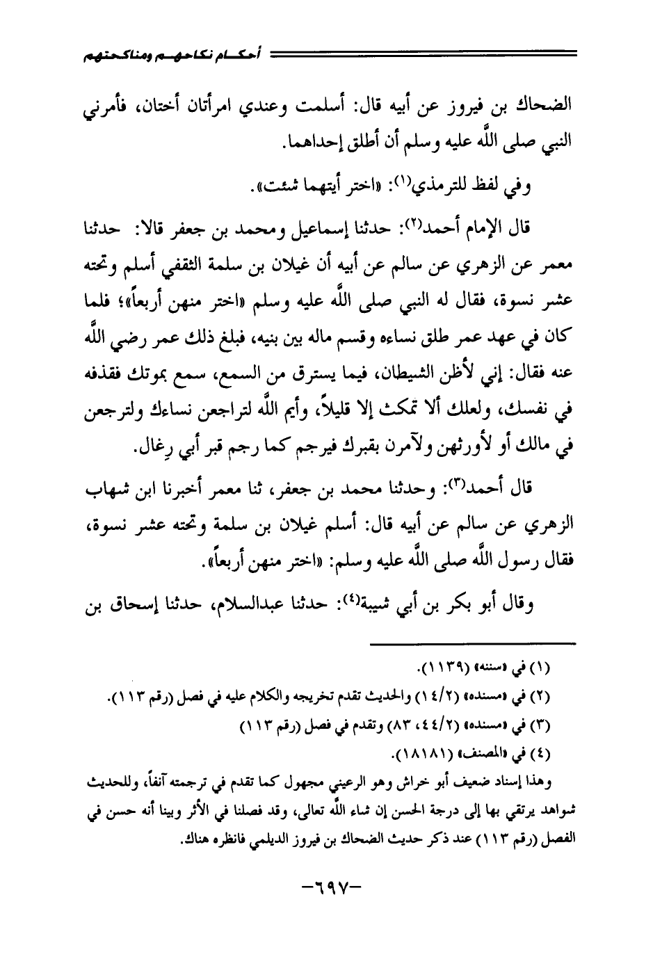 «الضَّحَّاكِ بْنِ فَيْرُوزٍ، عَنْ أَبِيهِ قَالَ: أَسْلَمْتُ وَعِنْدِي امْرَأَتَانِ أُخْتَانِ، فَأَمَرَنِي النَّبِيُّ - صَلَّى اللَّهُ عَلَيْهِ وَسَلَّمَ - أَنْ أُطَلِّقَ إِحْدَاهُمَا» .
