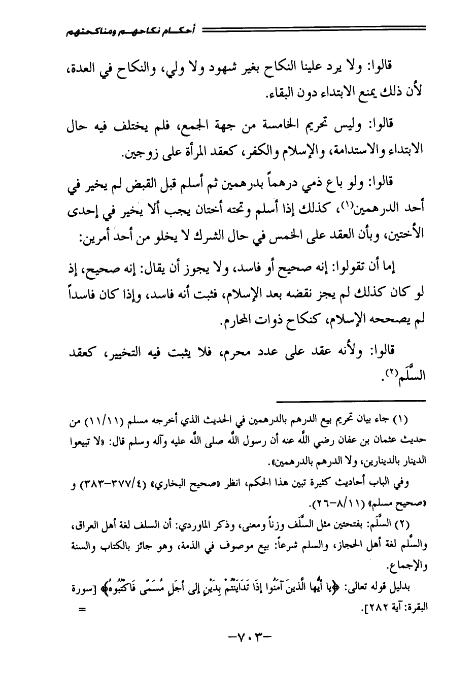قَالُوا: وَلَوْ بَاعَ ذِمِّيٌّ دِرْهَمًا بِدِرْهَمَيْنِ، ثُمَّ أَسْلَمَ قَبْلَ الْقَبْضِ لَمْ يُخَيَّرْ فِي أَحَدِ الدِّرْهَمَيْنِ، كَذَلِكَ إِذَا أَسْلَمَ وَتَحْتَهُ أُخْتَانِ يَجِبُ أَلَّا يُخَيَّرَ فِي إِحْدَى الْأُخْتَيْنِ، وَبِأَنَّ الْعَقْدَ عَلَى الْخَمْسِ فِي حَالِ الشِّرْكِ لَا يَخْلُو مِنْ أَحَدِ أَمْرَيْنِ: