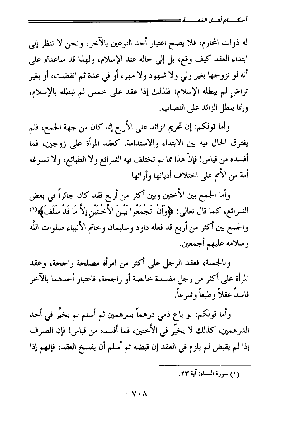وَأَمَّا قَوْلُكُمْ: إِنَّ تَحْرِيمَ الزَّائِدِ عَلَى الْأَرْبَعِ إِنَّمَا كَانَ مِنْ جِهَةِ الْجَمْعِ، فَلَمْ يَفْتَرِقِ الْحَالُ فِيهِ بَيْنَ الِابْتِدَاءِ، وَالِاسْتِدَامَةِ، كَعَقْدِ الْمَرْأَةِ عَلَى زَوْجَيْنِ، فَمَا أَفْسَدَهُ مِنْ قِيَاسٍ! فَإِنَّ هَذَا مِمَّا لَمْ تَخْتَلِفُ فِيهِ الشَّرَائِعُ وَلَا الطَّبَائِعُ، وَلَا تُسَوِّغُهُ أُمَّةٌ مِنَ الْأُمَمِ عَلَى اخْتِلَافِ أَدْيَانِهَا وَآرَائِهَا.