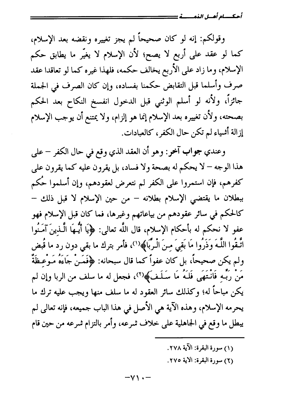وَعِنْدِي جَوَابٌ آخَرُ: وَهُوَ أَنَّ الْعَقْدَ الَّذِي وَقَعَ فِي حَالِ الْكُفْرِ - عَلَى هَذَا الْوَجْهِ - لَا يُحْكَمُ لَهُ بِصِحَّةٍ، وَلَا فَسَادٍ، بَلْ يُقَرُّونَ عَلَيْهِ كَمَا يُقَرُّونَ عَلَى كُفْرِهِمْ، فَإِنِ اسْتَمَرُّوا عَلَى الْكُفْرِ لَمْ نَتَعَرَّضْ لِعُقُودِهِمْ، وَإِنْ أَسْلَمُوا حُكِمَ بِبُطْلَانِ مَا يَقْتَضِي الْإِسْلَامُ بُطْلَانَهُ - مِنْ حِينِ الْإِسْلَامِ لَا قَبْلَ ذَلِكَ - كَالْحُكْمِ فِي سَائِرِ عُقُودِهِمْ مِنْ بِيَاعَاتِهِمْ وَغَيْرِهَا، فَمَا كَانَ قَبْلَ الْإِسْلَامِ فَهُوَ عَفْوٌ لَا نَحْكُمُ لَهُ بِأَحْكَامِ الْإِسْلَامِ، قَالَ اللَّهُ تَعَالَى: {يَاأَيُّهَا الَّذِينَ آمَنُوا اتَّقُوا اللَّهَ وَذَرُوا مَا بَقِيَ مِنَ الرِّبَا} [البقرة: 278] ، فَأَمَرَ بِتَرْكِ مَا بَقِيَ دُونَ رَدِّ مَا قُبِضَ، وَلَمْ يَكُنْ صَحِيحًا، بَلْ كَانَ عَفْوًا كَمَا قَالَ سُبْحَانَهُ: {فَمَنْ جَاءَهُ مَوْعِظَةٌ مِنْ رَبِّهِ فَانْتَهَى فَلَهُ مَا سَلَفَ} [البقرة: 275] ، فَجَعَلَ لَهُ مَا سَلَفَ مِنَ الرِّبَا، وَإِنْ لَمْ يَكُنْ مُبَاحًا لَهُ، وَكَذَلِكَ سَائِرُ الْعُقُودِ لَهُ مَا سَلَفَ مِنْهَا، وَيَجِبُ عَلَيْهِ تَرْكُ مَا يُحَرِّمُهُ الْإِسْلَامُ، وَهَذِهِ الْآيَةُ هِيَ الْأَصْلُ فِي هَذَا الْبَابِ جَمِيعِهِ، فَإِنَّهُ تَعَالَى لَمْ يُبْطِلْ مَا وَقَعَ فِي الْجَاهِلِيَّةِ عَلَى خِلَافِ شَرْعِهِ، وَأَمَرَ بِالْتِزَامِ شَرْعِهِ مِنْ حِينِ قَامَ