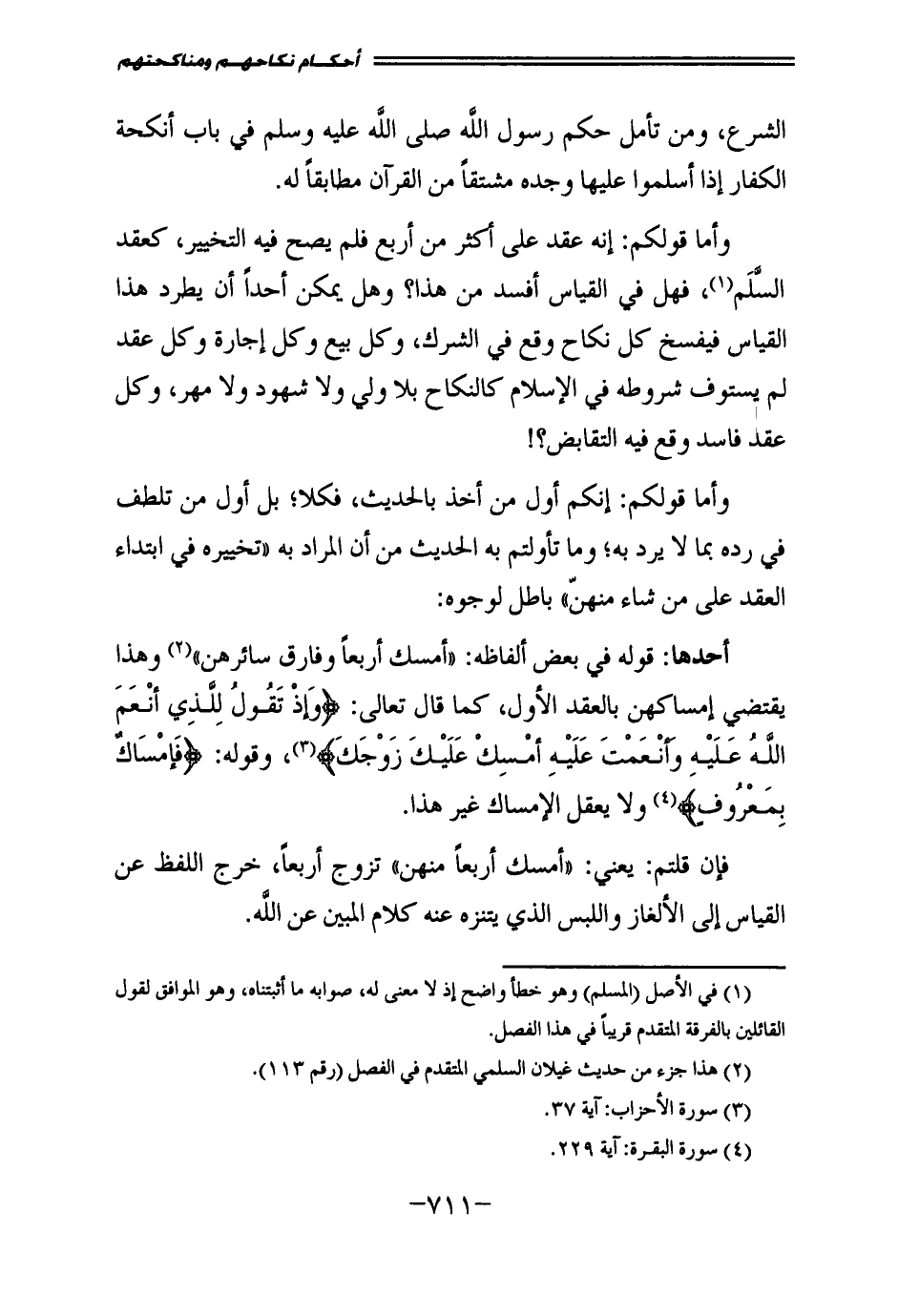 وَأَمَّا قَوْلُكُمْ: إِنَّكُمْ أَوَّلُ مَنْ أَخَذَ بِالْحَدِيثِ، فَكَلَّا بَلْ أَوَّلُ مَنْ تَلَطَّفَ فِي رَدِّهِ بِمَا لَا يُرَدُّ بِهِ، وَمَا تَأَوَّلْتُمْ بِهِ الْحَدِيثَ مِنْ أَنَّ الْمُرَادَ بِهِ " تَخْيِيرُهُ فِي ابْتِدَاءِ الْعَقْدِ عَلَى مَنْ شَاءَ مِنْهُنَّ " بَاطِلٌ لِوُجُوهٍ.