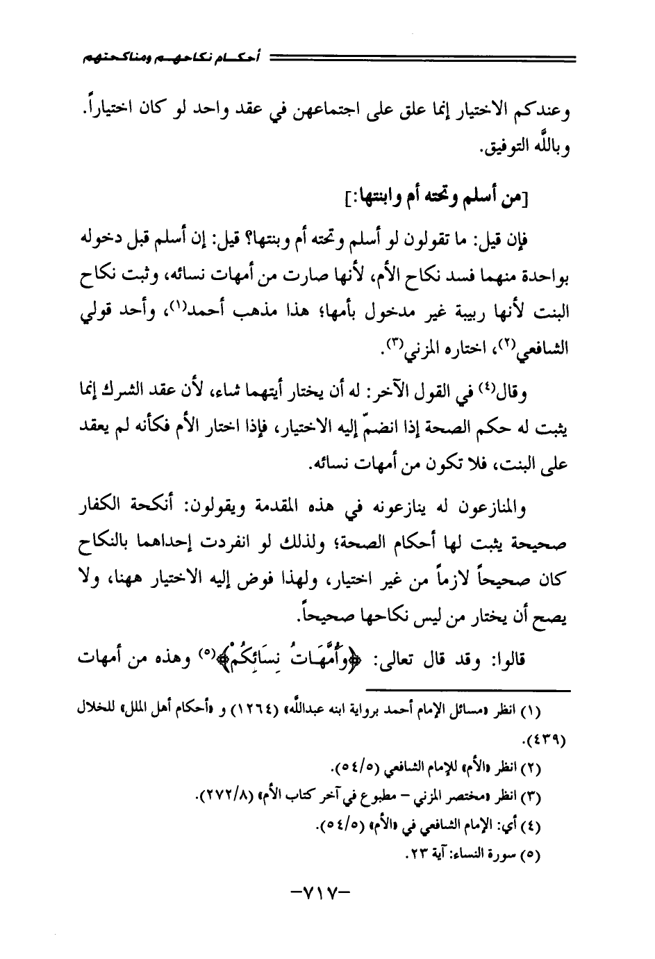 فَإِنْ قِيلَ: مَا تَقُولُونَ لَوْ أَسْلَمَ وَتَحْتَهُ أُمٌّ وَبِنْتُهَا؟ قِيلَ: إِنْ أَسْلَمَ قَبْلَ دُخُولِهِ بِوَاحِدَةٍ مِنْهُمَا فَسَدَ نِكَاحُ الْأُمِّ، لِأَنَّهَا صَارَتْ مِنْ أُمَّهَاتِ نِسَائِهِ، وَثَبَتَ نِكَاحُ الْبِنْتِ لِأَنَّهَا رَبِيبَةٌ غَيْرُ مَدْخُولٍ بِأُمِّهَا، هَذَا مَذْهَبُ أَحْمَدَ، وَأَحَدُ قَوْلَيِ الشَّافِعِيِّ، اخْتَارَهُ الْمُزَنِيُّ.