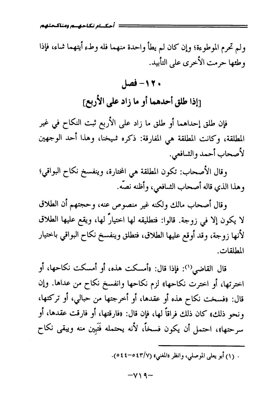 وَقَالَ الْأَصْحَابُ: تَكُونُ الْمُطَلَّقَةُ هِيَ الْمُخْتَارَةُ، وَيَنْفَسِخُ نِكَاحُ الْبَوَاقِي، وَهَذَا الَّذِي قَالَهُ أَصْحَابُ الشَّافِعِيِّ، وَأَظُنُّهُ نَصَّهُ.