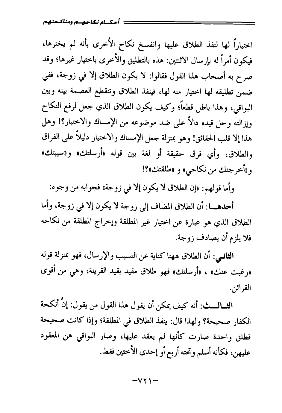 الثَّالِثُ: أَنَّهُ كَيْفَ يُمْكِنُ أَنْ يَقُولَ هَذَا الْقَوْلَ مَنْ يَقُولُ: إِنَّ أَنْكِحَةَ الْكُفَّارِ صَحِيحَةٌ؟ وَلِهَذَا قَالَ يَنْفُذُ الطَّلَاقُ فِي الْمُطَلَّقَةِ، وَإِذَا كَانَتْ صَحِيحَةً فَطَلَّقَ وَاحِدَةً صَارَتْ كَأَنَّهَا لَمْ يَعْقِدْ عَلَيْهَا، وَصَارَ الْبَوَاقِي هُنَّ الْمَعْقُودُ عَلَيْهِنَّ، فَكَأَنَّهُ أَسْلَمَ وَتَحْتَهُ أَرْبَعٌ أَوْ إِحْدَى الْأُخْتَيْنِ فَقَطْ.