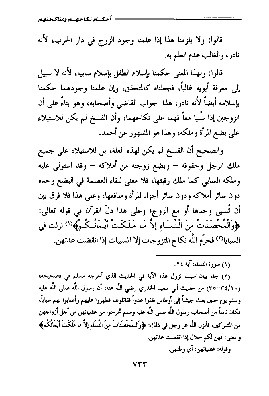 وَالصَّحِيحُ أَنَّ الْفَسْخَ لَمْ يَكُنْ لِهَذِهِ الْعِلَّةِ، بَلْ لِلِاسْتِيلَاءِ عَلَى جَمِيعِ مِلْكِ الرَّجُلِ وَحُقُوقِهِ - وَبُضْعُ زَوْجَتِهِ مِنْ أَمْلَاكِهِ - وَقَدِ اسْتَوْلَى عَلَيْهِ وَمَلَكَهُ السَّابِي كَمَا مَلَكَ رَقَبَتَهَا، فَلَا مَعْنَى لِبَقَاءِ الْعِصْمَةِ فِي الْبُضْعِ وَحْدَهُ دُونَ سَائِرِ أَمْلَاكِهِ وَدُونَ سَائِرِ أَجْزَاءِ الْمَرْأَةِ، وَمَنَافِعِهَا، وَعَلَى هَذَا فَلَا فَرْقَ بَيْنَ أَنْ تُسْبَى وَحْدَهَا أَوْ مَعَ الزَّوْجِ، وَعَلَى هَذَا دَلَّ الْقُرْآنُ فِي قَوْلِهِ تَعَالَى: {وَالْمُحْصَنَاتُ مِنَ النِّسَاءِ إِلَّا مَا مَلَكَتْ أَيْمَانُكُمْ} [النساء: 24] ، نَزَلَتْ فِي السَّبَايَا فَحَرَّمَ اللَّهُ نِكَاحَ الْمُتَزَوِّجَاتِ إِلَّا الْمَسْبِيَّاتِ إِذَا انْقَضَتْ عِدَّتُهُنَّ.