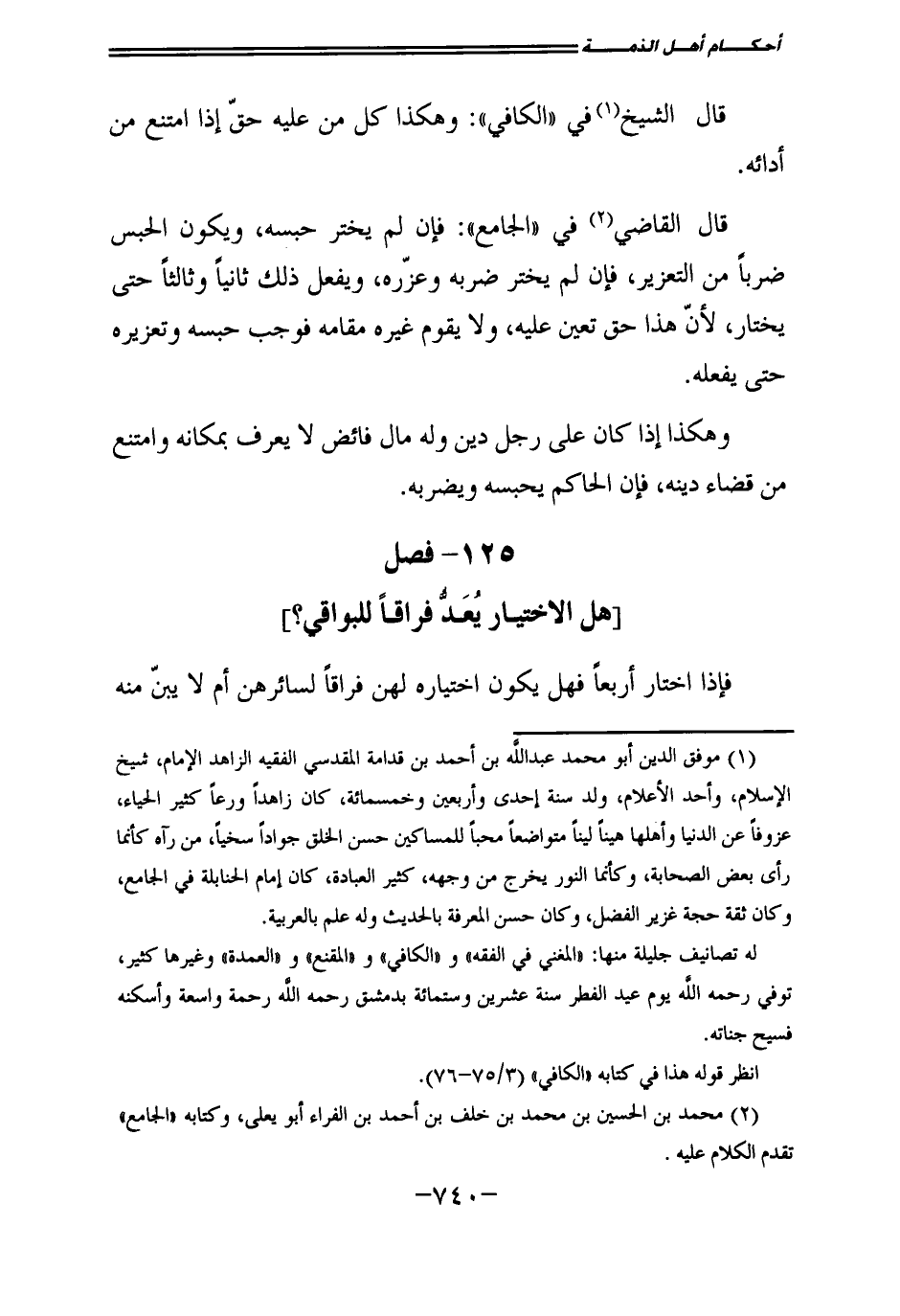 قَالَ الْقَاضِي فِي " الْجَامِعِ ": فَإِنْ لَمْ يَخْتَرْ حَبَسَهُ، وَيَكُونُ الْحَبْسُ ضَرْبًا مِنَ التَّعْزِيرِ، فَإِنْ لَمْ يَخْتَرْ ضَرَبَهُ وَعَزَّرَهُ، وَيَفْعَلُ ذَلِكَ ثَانِيًا، وَثَالِثًا حَتَّى يَخْتَارَ؛ لِأَنَّ هَذَا حَقٌّ تَعَيَّنَ عَلَيْهِ، وَلَا يَقُومُ غَيْرُهُ مَقَامَهُ فَوَجَبَ حَبْسُهُ، وَتَعْزِيرُهُ حَتَّى يَفْعَلَهُ.