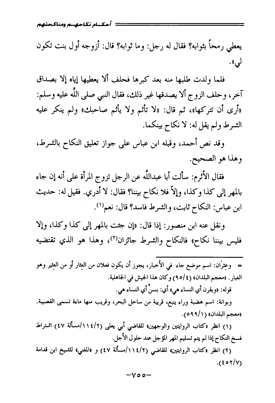 فَقَالَ الْأَثْرَمُ: سَأَلْتُ أَبَا عَبْدِ اللَّهِ عَنِ الرَّجُلِ تَزَوَّجَ الْمَرْأَةَ عَلَى أَنَّهُ إِنْ جَاءَ بِالْمَهْرِ إِلَى كَذَا وَكَذَا، وَإِلَّا فَلَا نِكَاحَ بَيْنَنَا؟ فَقَالَ: لَا أَدْرِي، فَقِيلَ لَهُ: حَدِيثُ ابْنِ عَبَّاسٍ: النِّكَاحُ ثَابِتٌ، وَالشَّرْطُ فَاسِدٌ؟ قَالَ: نَعَمْ.