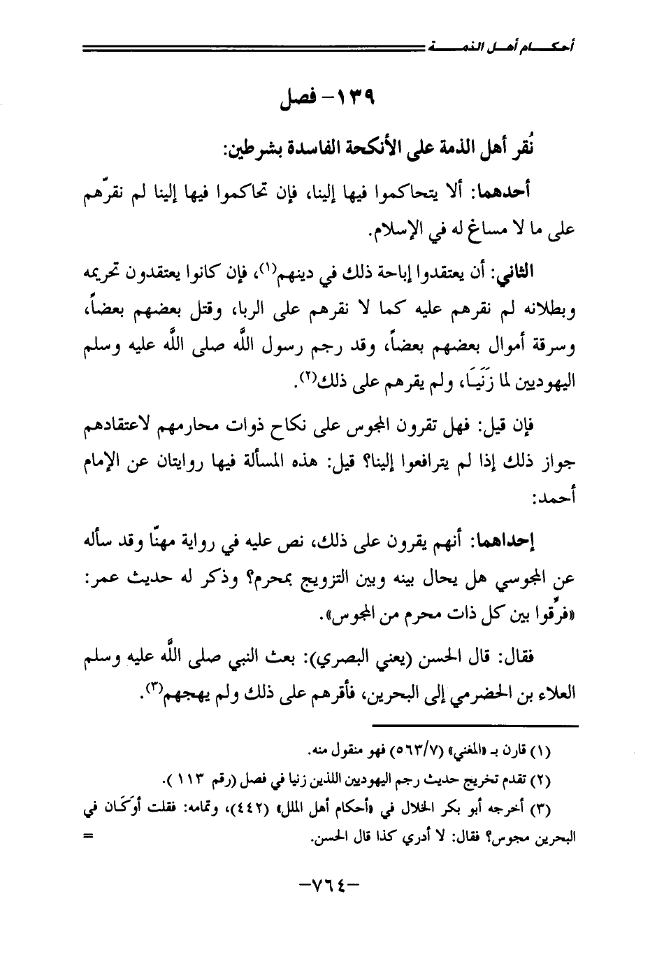 أَحَدُهُمَا: أَلَّا يَتَحَاكَمُوا فِيهَا إِلَيْنَا، فَإِنْ تَحَاكَمُوا فِيهَا إِلَيْنَا لَمْ نُقِرَّهُمْ عَلَى مَا لَا مَسَاغَ لَهُ فِي الْإِسْلَامِ.