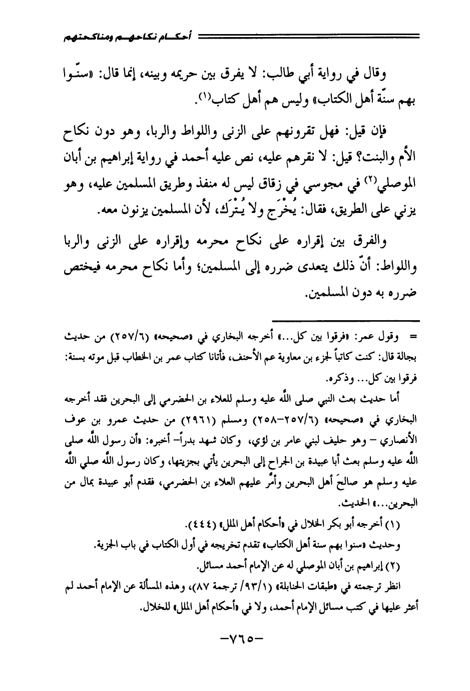 وَقَالَ فِي رِوَايَةِ أَبِي طَالِبٍ: لَا يُفَرَّقُ بَيْنَ حَرِيمِهِ وَبَيْنَهُ، إِنَّمَا قَالَ: " «سُنُّوا بِهِمْ سُنَّةَ أَهْلِ الْكِتَابِ» " وَلَيْسَ هُمْ أَهْلَ كِتَابٍ.