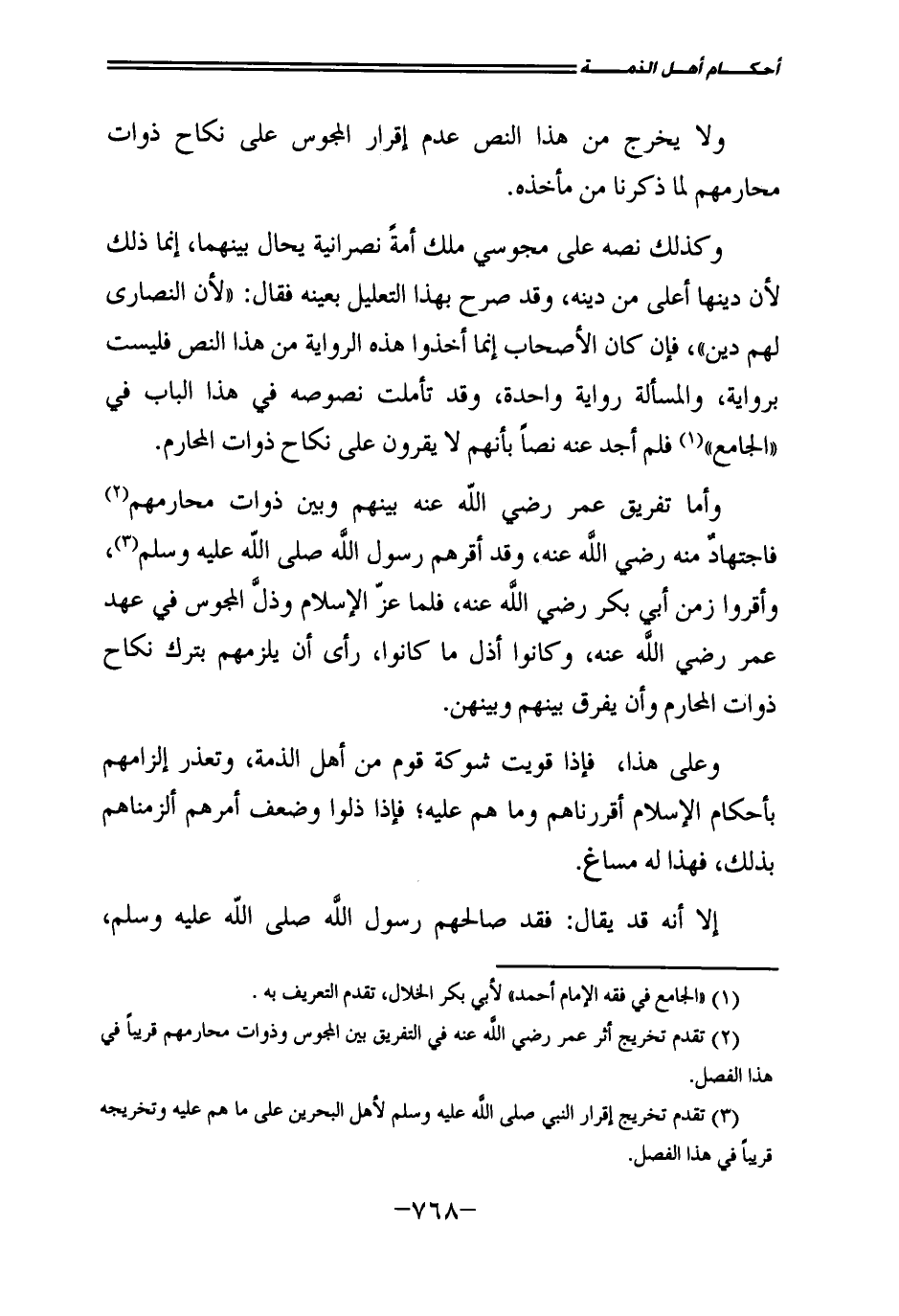 وَأَمَّا تَفْرِيقُ عُمَرَ - رَضِيَ اللَّهُ عَنْهُ - بَيْنَهُمْ وَبَيْنَ ذَوَاتِ مَحَارِمِهِمْ فَاجْتِهَادٌ مِنْهُ - رَضِيَ اللَّهُ عَنْهُ - وَقَدْ أَقَرَّهُمْ رَسُولُ اللَّهِ - صَلَّى اللَّهُ عَلَيْهِ وَسَلَّمَ - وَأُقِرُّوا زَمَنَ أَبِي بَكْرٍ - رَضِيَ اللَّهُ عَنْهُ - فَلَمَّا عَزَّ الْإِسْلَامُ، وَذَلَّ الْمَجُوسُ فِي عَهْدِ عُمَرَ - رَضِيَ اللَّهُ عَنْهُ - وَكَانُوا أَذَلَّ مَا كَانُوا، رَأَى أَنْ يُلْزِمَهُمْ بِتَرْكِ نِكَاحِ ذَوَاتِ الْمَحَارِمِ وَأَنْ يُفَرِّقَ بَيْنَهُمْ وَبَيْنَهُنَّ.