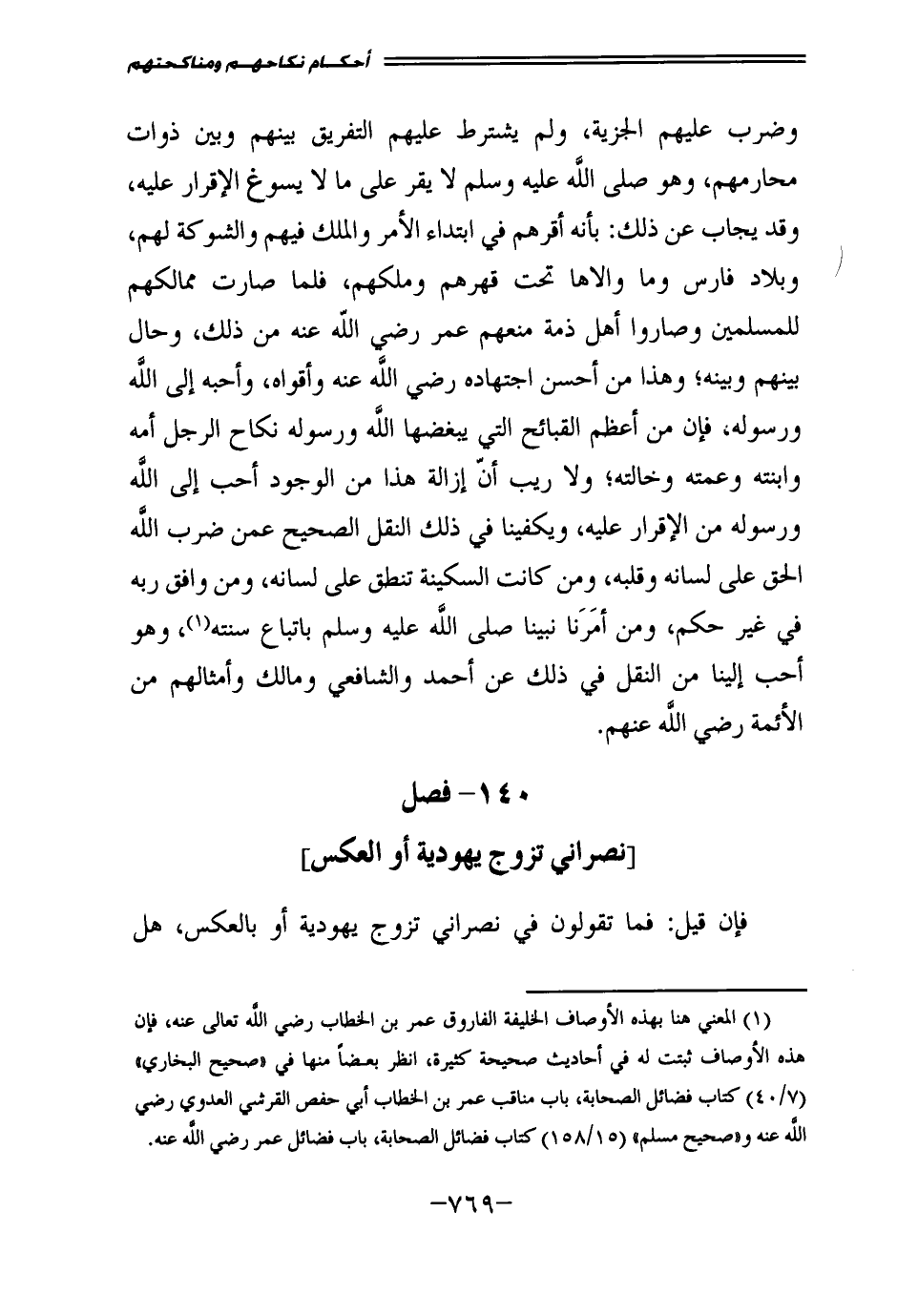 وَضَرَبَ عَلَيْهِمُ الْجِزْيَةَ، وَلَمْ يَشْتَرِطْ عَلَيْهِمُ التَّفْرِيقَ بَيْنَهُمْ، وَبَيْنَ ذَوَاتِ مَحَارِمِهِمْ، وَهُوَ لَا يُقِرُّ عَلَى مَا لَا يَسُوغُ الْإِقْرَارُ عَلَيْهِ، وَقَدْ يُجَابُ عَنْ ذَلِكَ: بِأَنَّهُ أَقَرَّهُمْ فِي ابْتِدَاءِ الْأَمْرِ، وَالْمُلْكُ فِيهِمْ، وَالشَّوْكَةُ لَهُمْ، وَبِلَادُ فَارِسَ وَمَا وَالَاهَا تَحْتَ قَهْرِهِمْ وَمُلْكِهِمْ، فَلَمَّا صَارَتْ مَمَالِكُهُمْ لِلْمُسْلِمِينَ، وَصَارُوا أَهْلَ ذِمَّةٍ مَنَعَهُمْ عُمَرُ - رَضِيَ اللَّهُ عَنْهُ - مِنْ ذَلِكَ، وَحَالَ بَيْنَهُمْ وَبَيْنَهُ، وَهَذَا مِنْ أَحْسَنِ اجْتِهَادِهِ - رَضِيَ اللَّهُ عَنْهُ - وَأَقْوَاهُ، وَأَحَبِّهِ إِلَى اللَّهِ وَرَسُولِهِ، فَإِنَّ مِنْ أَعْظَمِ الْقَبَائِحِ الَّتِي يُبْغِضُهَا اللَّهُ وَرَسُولُهُ نِكَاحَ الرَّجُلِ أُمَّهُ، وَابْنَتَهُ، وَعَمَّتَهُ، وَخَالَتَهُ، وَلَا رَيْبَ أَنَّ إِزَالَةَ هَذَا مِنَ الْوُجُودِ أَحَبُّ إِلَى اللَّهِ وَرَسُولِهِ مِنَ الْإِقْرَارِ عَلَيْهِ، وَيَكْفِينَا فِي ذَلِكَ النَّقْلُ الصَّحِيحُ عَمَّنْ ضَرَبَ اللَّهُ الْحَقَّ عَلَى لِسَانِهِ وَقَلْبِهِ، وَمَنْ كَانَتِ السَّكِينَةُ تَنْطِقُ عَلَى لِسَانِهِ، وَمَنْ وَافَقَ رَبَّهُ فِي غَيْرِ حُكْمٍ، وَمَنْ أَمَرَنَا نَبِيُّنَا - صَلَّى اللَّهُ عَلَيْهِ وَسَلَّمَ - بِاتِّبَاعِ سُنَّتِهِ، وَهُوَ أَحَبُّ إِلَيْنَا مِنَ النَّقْلِ فِي ذَلِكَ عَنْ أَحْمَدَ، وَالشَّافِعِيِّ، وَمَالِكٍ، وَأَمْثَالِهِمْ مِنَ الْأَئِمَّةِ - رَضِيَ اللَّهُ عَنْهُمْ -.