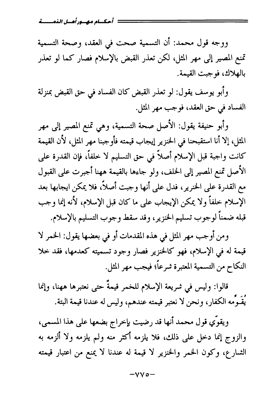 وَمَنْ أَوْجَبَ مَهْرَ الْمِثْلِ فِي هَذِهِ الْمُقَدِّمَاتِ، أَوْ فِي بَعْضِهَا يَقُولُ: الْخَمْرُ لَا قِيمَةَ لَهُ فِي الْإِسْلَامِ، فَهُوَ كَالْخِنْزِيرِ، فَصَارَ وُجُودُ تَسْمِيَتِهِ كَعَدَمِهَا، فَقَدْ خَلَا النِّكَاحُ مِنَ التَّسْمِيَةِ الْمُعْتَبَرَةِ شَرْعًا، فَيَجِبُ مَهْرُ الْمِثْلِ.