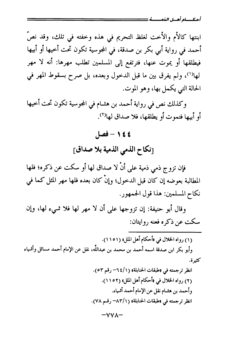ابْنَتُهَا كَالْأُمِّ، وَالْأُخْتِ لِغِلَظِ التَّحْرِيمِ فِي هَذِهِ وَخِفَّتِهِ فِي تِلْكَ، وَقَدْ نَصَّ أَحْمَدُ فِي رِوَايَةِ أَبِي بَكْرِ بْنِ صَدَقَةَ، فِي الْمَجُوسِيَّةِ تَكُونُ تَحْتَ أَخِيهَا، أَوْ أَبِيهَا فَيُطَلِّقُهَا، أَوْ يَمُوتُ عَنْهَا، فَتَرْتَفِعُ إِلَى الْمُسْلِمِينَ تَطْلُبُ مَهْرَهَا: أَنَّهُ لَا مَهْرَ لَهَا، وَلَمْ يُفَرِّقْ بَيْنَ مَا قَبْلَ الدُّخُولِ وَبَعْدَهُ بَلْ صَرَّحَ بِسُقُوطِ الْمَهْرِ فِي الْحَالَةِ الَّتِي يَكْمُلُ بِهَا وَهُوَ الْمَوْتُ.