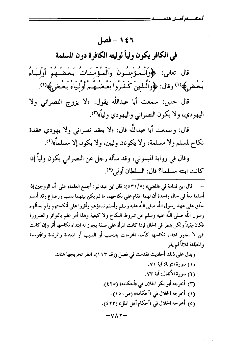 قَالَ حَنْبَلٌ: سَمِعْتُ أَبَا عَبْدِ اللَّهِ يَقُولُ: " لَا يُزَوَّجُ النَّصْرَانِيُّ، وَلَا الْيَهُودِيُّ، وَلَا يَكُونُ النَّصْرَانِيُّ وَالْيَهُودِيُّ وَلِيًّا ".
