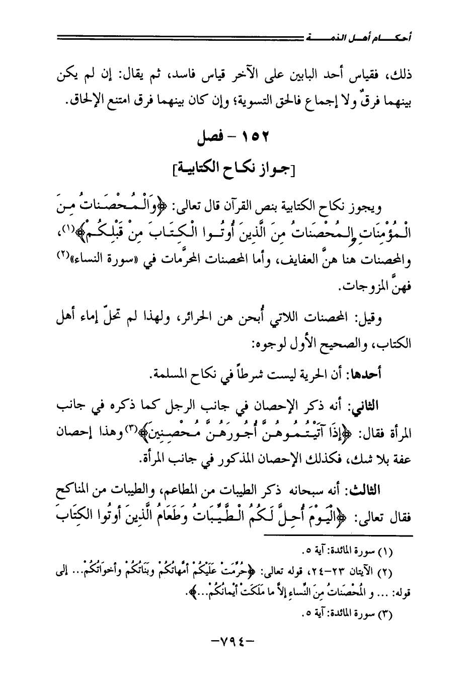 وَيَجُوزُ نِكَاحُ الْكِتَابِيَّةِ بِنَصِّ الْقُرْآنِ قَالَ تَعَالَى: {وَالْمُحْصَنَاتُ مِنَ الْمُؤْمِنَاتِ وَالْمُحْصَنَاتُ مِنَ الَّذِينَ أُوتُوا الْكِتَابَ مِنْ قَبْلِكُمْ} [المائدة: 5] ، وَالْمُحْصَنَاتُ هُنَا هُنَّ الْعَفَايِفُ، وَأَمَّا الْمُحْصَنَاتُ الْمُحَرَّمَاتُ فِي " سُورَةِ النِّسَاءِ " فَهُنَّ الْمُزَوَّجَاتُ.