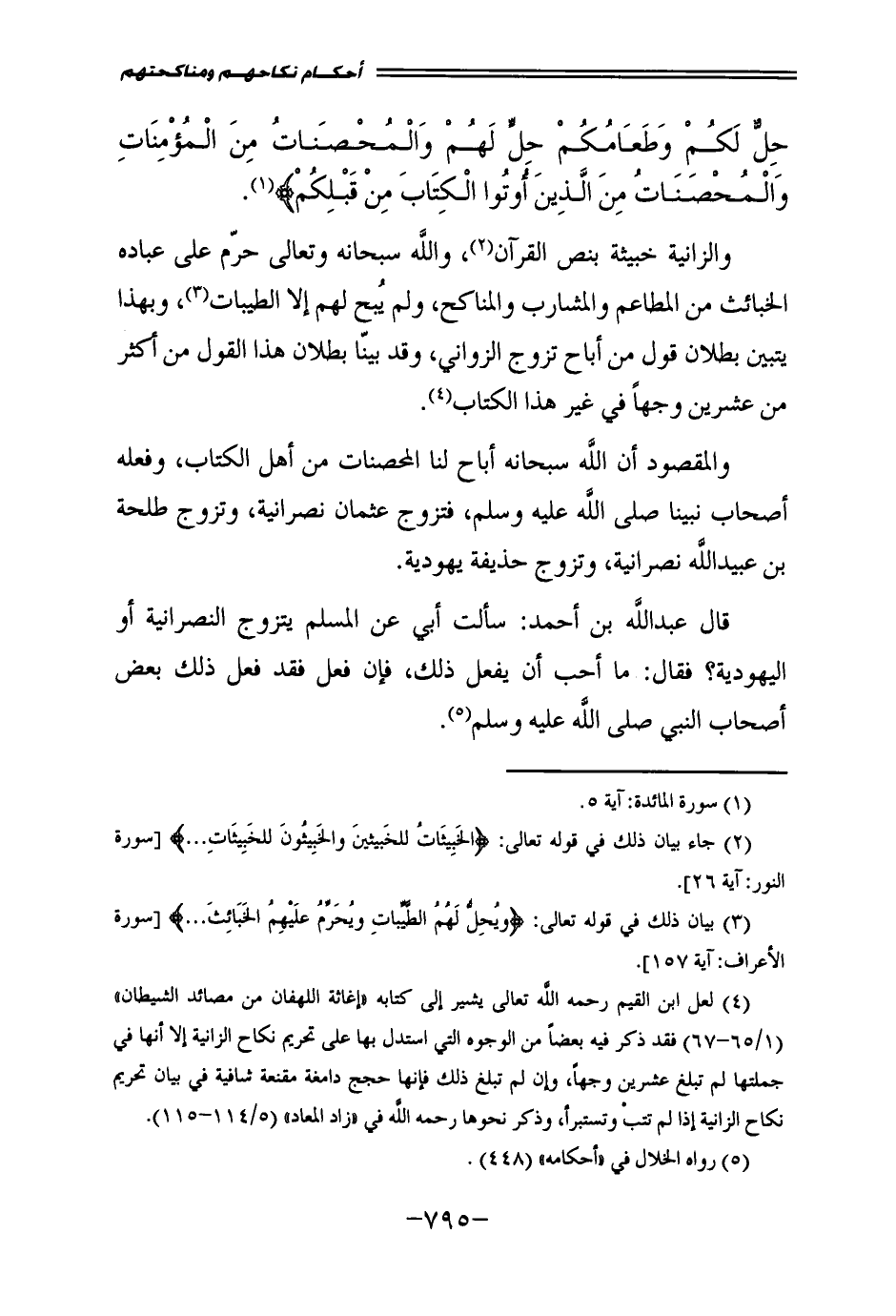 وَالْمَقْصُودُ أَنَّ اللَّهَ سُبْحَانَهُ أَبَاحَ لَنَا الْمُحْصَنَاتِ مِنْ أَهْلِ الْكِتَابِ، وَفَعَلَهُ أَصْحَابُ نَبِيِّنَا - صَلَّى اللَّهُ عَلَيْهِ وَسَلَّمَ - فَتَزَوَّجَ عُثْمَانُ نَصْرَانِيَّةً، وَتَزَوَّجَ طَلْحَةُ بْنُ عُبَيْدِ اللَّهِ نَصْرَانِيَّةً، وَتَزَوَّجَ حُذَيْفَةُ يَهُودِيَّةً.