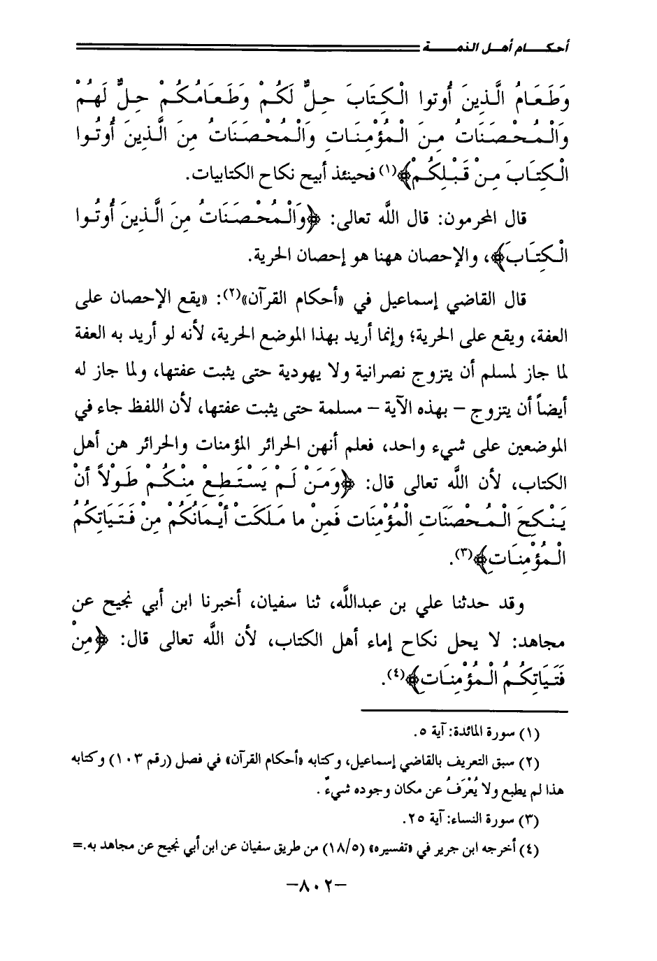 قَالَ الْقَاضِي إِسْمَاعِيلُ فِي " أَحْكَامِ الْقُرْآنِ ": " يَقَعُ الْإِحْصَانُ عَلَى الْعِفَّةِ، وَيَقَعُ عَلَى الْحُرِّيَّةِ، وَإِنَّمَا أُرِيدَ بِهَذَا الْمَوْضِعِ الْحُرِّيَّةُ؛ لِأَنَّهُ لَوْ أُرِيدَ بِهِ الْعِفَّةُ لَمَا جَازَ لِمُسْلِمٍ أَنْ يَتَزَوَّجَ نَصْرَانِيَّةً، وَلَا يَهُودِيَّةً حَتَّى يُثْبِتَ عِفَّتَهَا، وَلَمَا جَازَ لَهُ أَيْضًا أَنْ يَتَزَوَّجَ - بِهَذِهِ الْآيَةِ - مُسْلِمَةً حَتَّى يُثْبِتَ عِفَّتَهَا؛ لِأَنَّ اللَّفْظَ جَاءَ فِي الْمَوْضِعَيْنِ عَلَى شَيْءٍ وَاحِدٍ، فَعُلِمَ أَنَّهُنَّ الْحَرَائِرُ الْمُؤْمِنَاتُ، وَالْحَرَائِرُ هُنَّ أَهْلُ الْكِتَابِ لِأَنَّ اللَّهَ تَعَالَى قَالَ: {وَمَنْ لَمْ يَسْتَطِعْ مِنْكُمْ طَوْلًا أَنْ يَنْكِحَ الْمُحْصَنَاتِ الْمُؤْمِنَاتِ فَمِنْ مَا مَلَكَتْ أَيْمَانُكُمْ مِنْ فَتَيَاتِكُمُ الْمُؤْمِنَاتِ} [النساء: 25] .