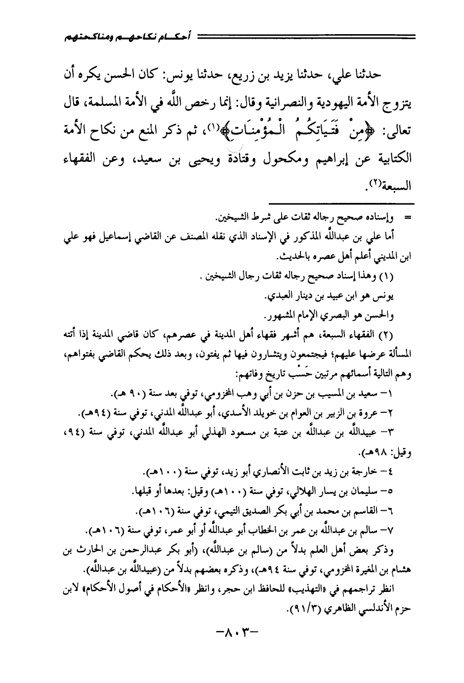 حَدَّثَنَا عَلِيٌّ، حَدَّثَنَا يَزِيدُ بْنُ زُرَيْعٍ، حَدَّثَنَا يُونُسُ: كَانَ الْحَسَنُ يَكْرَهُ أَنْ يَتَزَوَّجَ الْأَمَةَ الْيَهُودِيَّةَ وَالنَّصْرَانِيَّةَ، وَقَالَ: إِنَّمَا رَخَّصَ اللَّهُ فِي الْأَمَةِ الْمُسْلِمَةِ، قَالَ تَعَالَى: {مِنْ فَتَيَاتِكُمُ الْمُؤْمِنَاتِ} [النساء: 25] ، ثُمَّ ذَكَرَ الْمَنْعَ مِنْ نِكَاحِ الْأَمَةِ الْكِتَابِيَّةِ عَنْ إِبْرَاهِيمَ، وَمَكْحُولٍ، وَقَتَادَةَ، وَيَحْيَى بْنِ سَعِيدٍ، وَعَنِ الْفُقَهَاءِ السَّبْعَةِ.