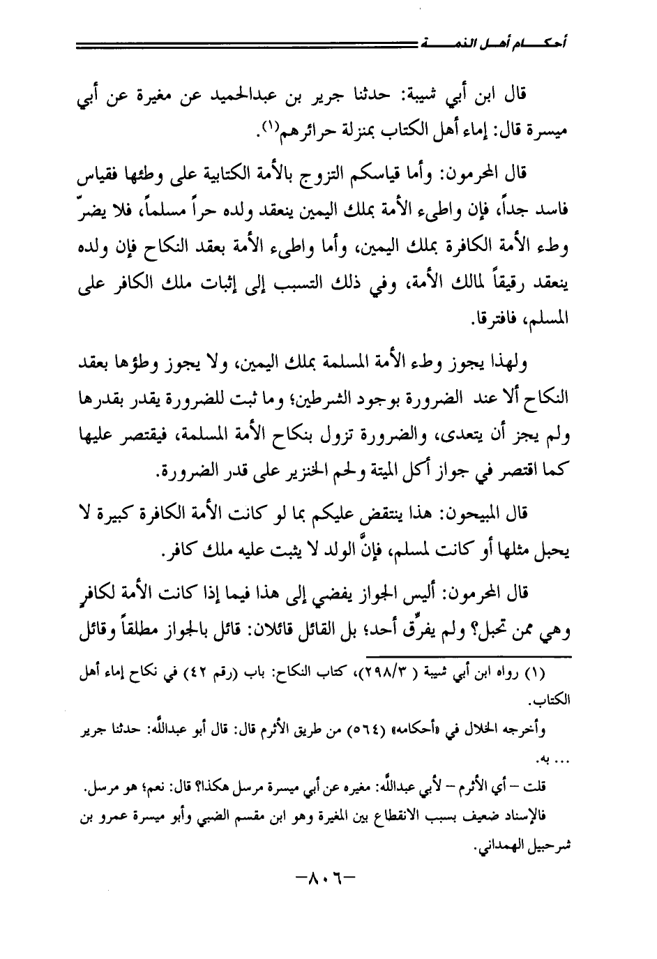 قَالَ ابْنُ أَبِي شَيْبَةَ: حَدَّثَنَا جَرِيرُ بْنُ عَبْدِ الْحَمِيدِ، عَنْ مُغِيرَةَ، عَنْ أَبِي مَيْسَرَةَ قَالَ: إِمَاءُ أَهْلِ الْكِتَابِ بِمَنْزِلَةِ حَرَائِرِهِمْ.