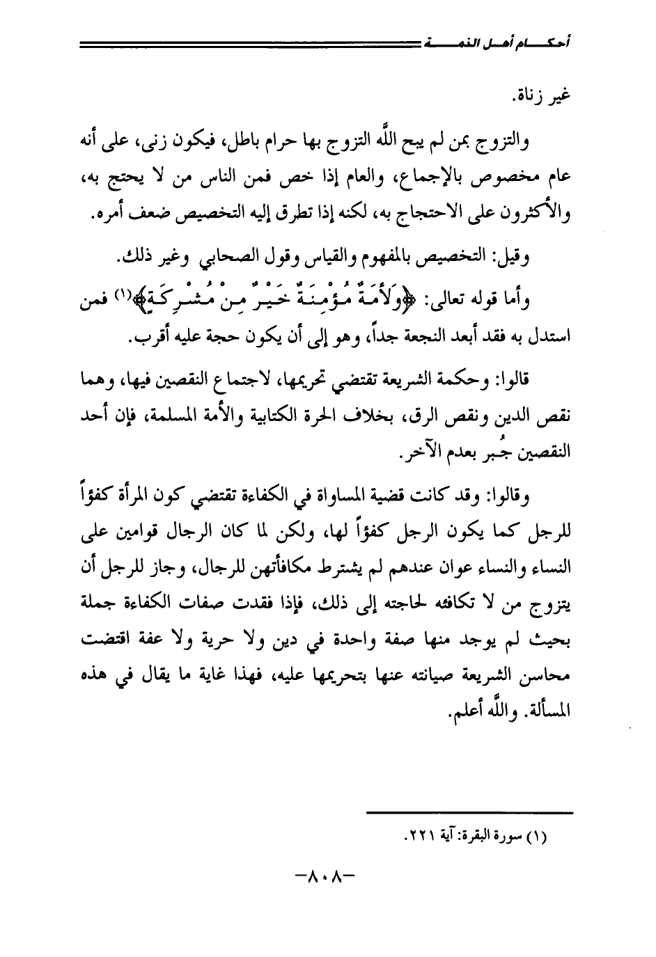وَأَمَّا قَوْلُهُ تَعَالَى: {وَلَأَمَةٌ مُؤْمِنَةٌ خَيْرٌ مِنْ مُشْرِكَةٍ} [البقرة: 221] ، فَمَنِ اسْتَدَلَّ بِهِ فَقَدْ أَبْعَدَ النُّجْعَةَ جِدًّا، وَهُوَ إِلَى أَنْ يَكُونَ حُجَّةً عَلَيْهِ أَقْرَبُ.