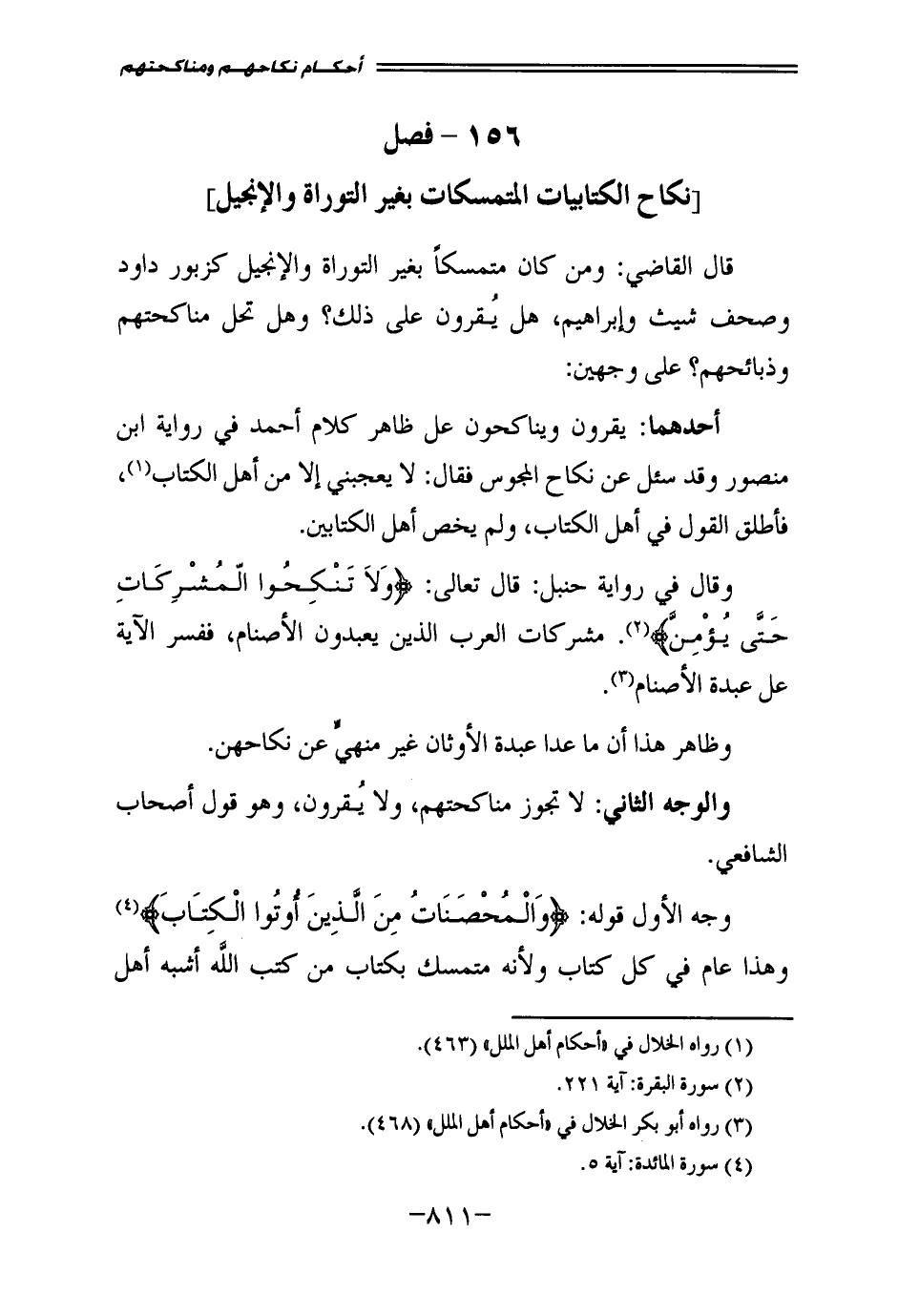وَقَالَ فِي رِوَايَةِ حَنْبَلٍ: قَالَ تَعَالَى: {وَلَا تَنْكِحُوا الْمُشْرِكَاتِ حَتَّى يُؤْمِنَّ} [البقرة: 221] ، مُشْرِكَاتِ الْعَرَبِ الَّذِينَ يَعْبُدُونَ الْأَصْنَامَ، فَفَسَّرَ الْآيَةَ عَلَى عَبَدَةِ الْأَصْنَامِ.
