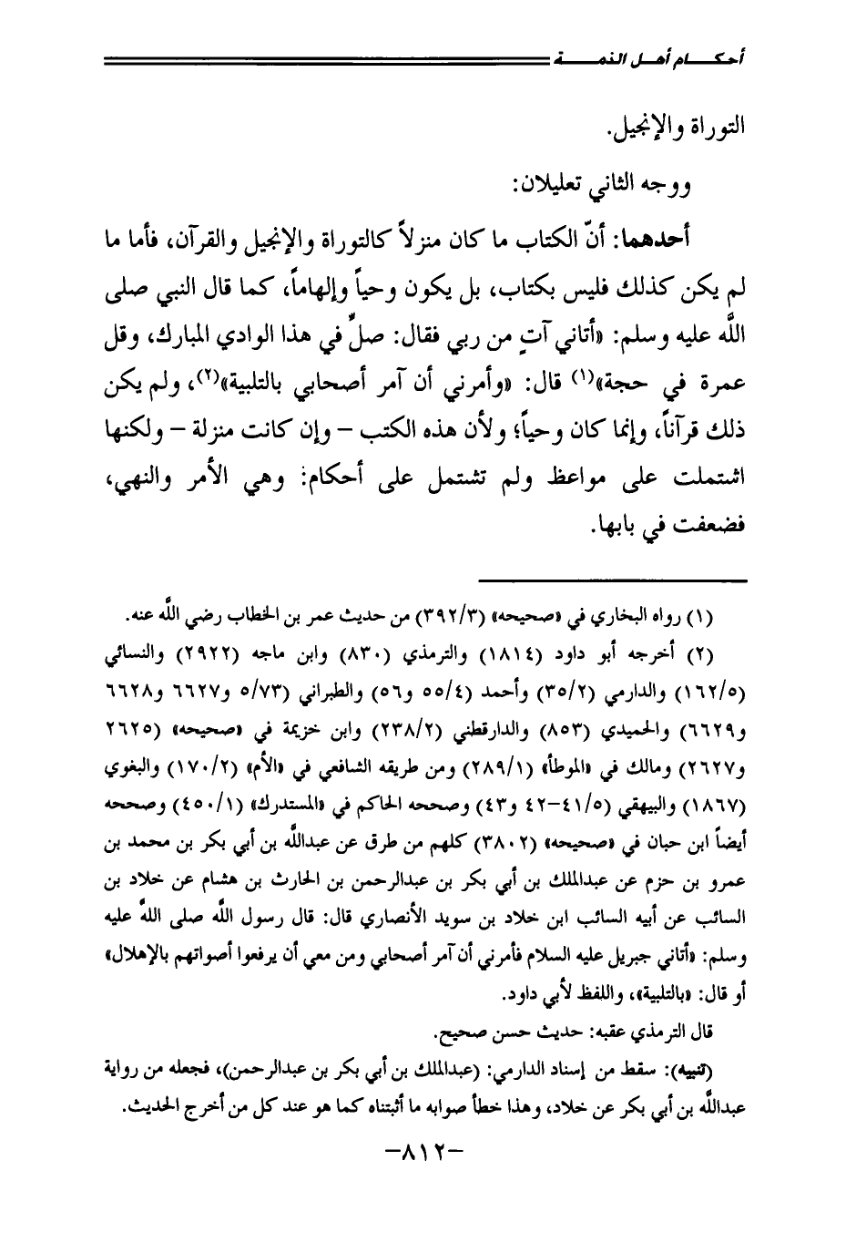 أَحَدُهُمَا: أَنَّ الْكِتَابَ مَا كَانَ مُنَزَّلًا كَالتَّوْرَاةِ، وَالْإِنْجِيلِ، وَالْقُرْآنِ، فَأَمَّا مَا لَمْ يَكُنْ كَذَلِكَ فَلَيْسَ بِكِتَابٍ، بَلْ يَكُونُ وَحْيًا وَإِلْهَامًا، كَمَا قَالَ النَّبِيُّ - صَلَّى اللَّهُ عَلَيْهِ وَسَلَّمَ -: " «أَتَانِي آتٍ مِنْ رَبِّي، فَقَالَ: صَلِّ فِي هَذَا الْوَادِي الْمُبَارَكِ، وَقُلْ: عُمْرَةٌ فِي حَجَّةٍ» "، قَالَ: " «وَأَمَرَنِي أَنْ آمُرَ أَصْحَابِي بِالتَّلْبِيَةِ» "، وَلَمْ يَكُنْ ذَلِكَ قُرْآنًا، وَإِنَّمَا كَانَ وَحْيًا، وَلِأَنَّ هَذِهِ الْكُتُبَ - وَإِنْ كَانَتْ مُنَزَّلَةً - وَلَكِنَّهَا اشْتَمَلَتْ عَلَى مَوَاعِظَ، وَلَمْ تَشْتَمِلْ عَلَى أَحْكَامٍ: وَهِيَ الْأَمْرُ وَالنَّهْيُ، فَضَعُفَتْ فِي بَابِهَا.