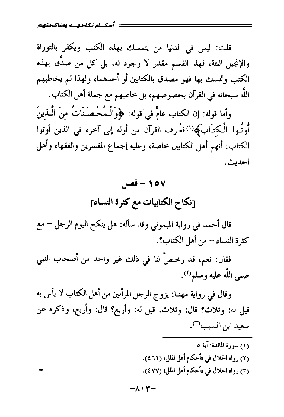 وَأَمَّا قَوْلُهُ: إِنَّ الْكِتَابَ عَامٌّ فِي قَوْلِهِ: {وَالْمُحْصَنَاتُ مِنَ الَّذِينَ أُوتُوا الْكِتَابَ} [المائدة: 5] ، فَعُرِفَ الْقُرْآنُ مِنْ أَوَّلِهِ إِلَى آخِرِهِ فِي الَّذِينَ أُوتُوا الْكِتَابَ أَنَّهُمْ أَهْلُ الْكِتَابَيْنِ خَاصَّةً، وَعَلَيْهِ إِجْمَاعُ الْمُفَسِّرِينَ، وَالْفُقَهَاءِ، وَأَهْلِ الْحَدِيثِ.