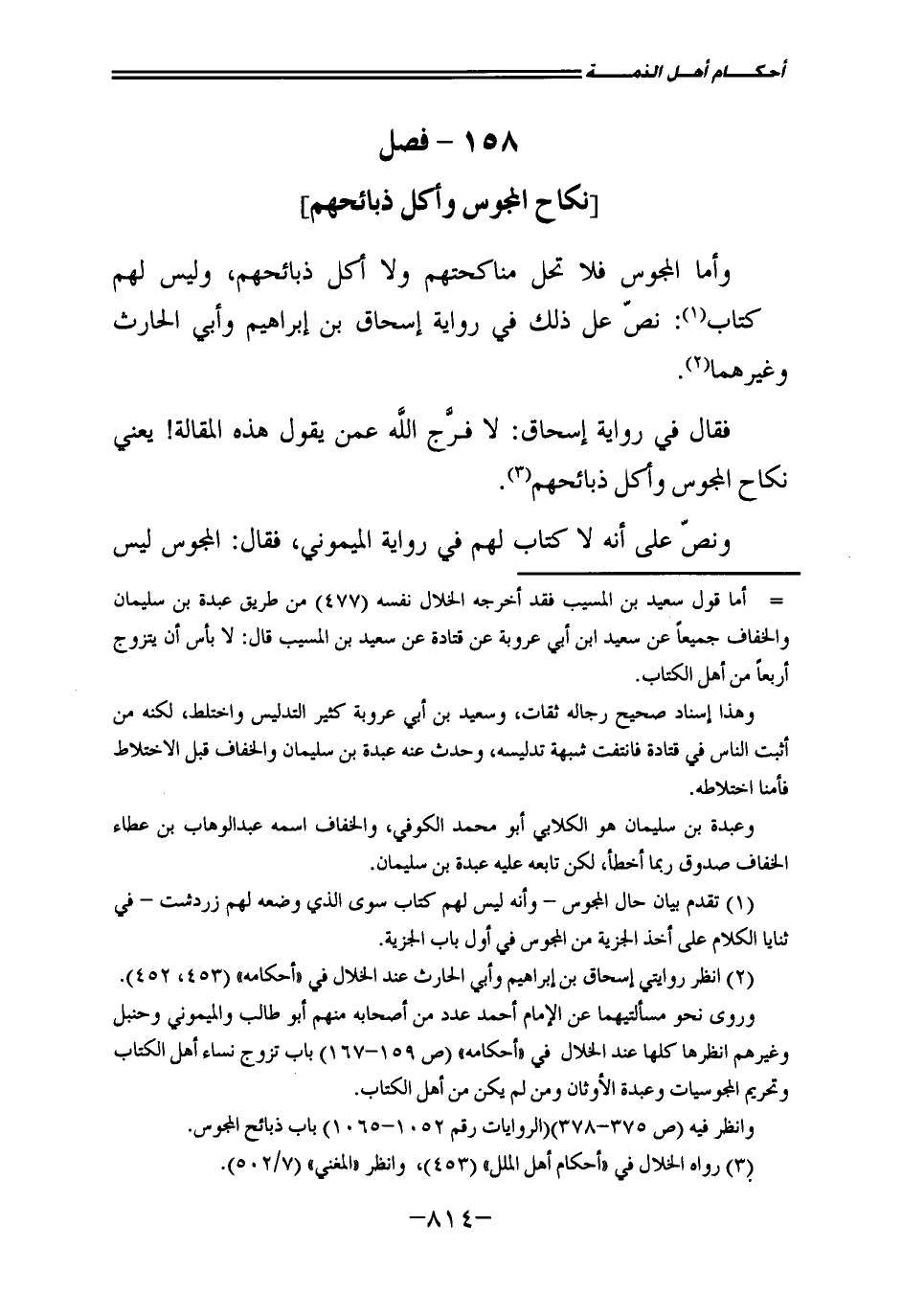 وَأَمَّا الْمَجُوسُ فَلَا تَحِلُّ مُنَاكَحَتُهُمْ، وَلَا أَكْلُ ذَبَائِحِهِمْ، وَلَيْسَ لَهُمْ كِتَابٌ: نَصَّ عَلَى ذَلِكَ فِي رِوَايَةِ إِسْحَاقَ بْنِ إِبْرَاهِيمَ، وَأَبِي الْحَارِثِ وَغَيْرِهِمَا.