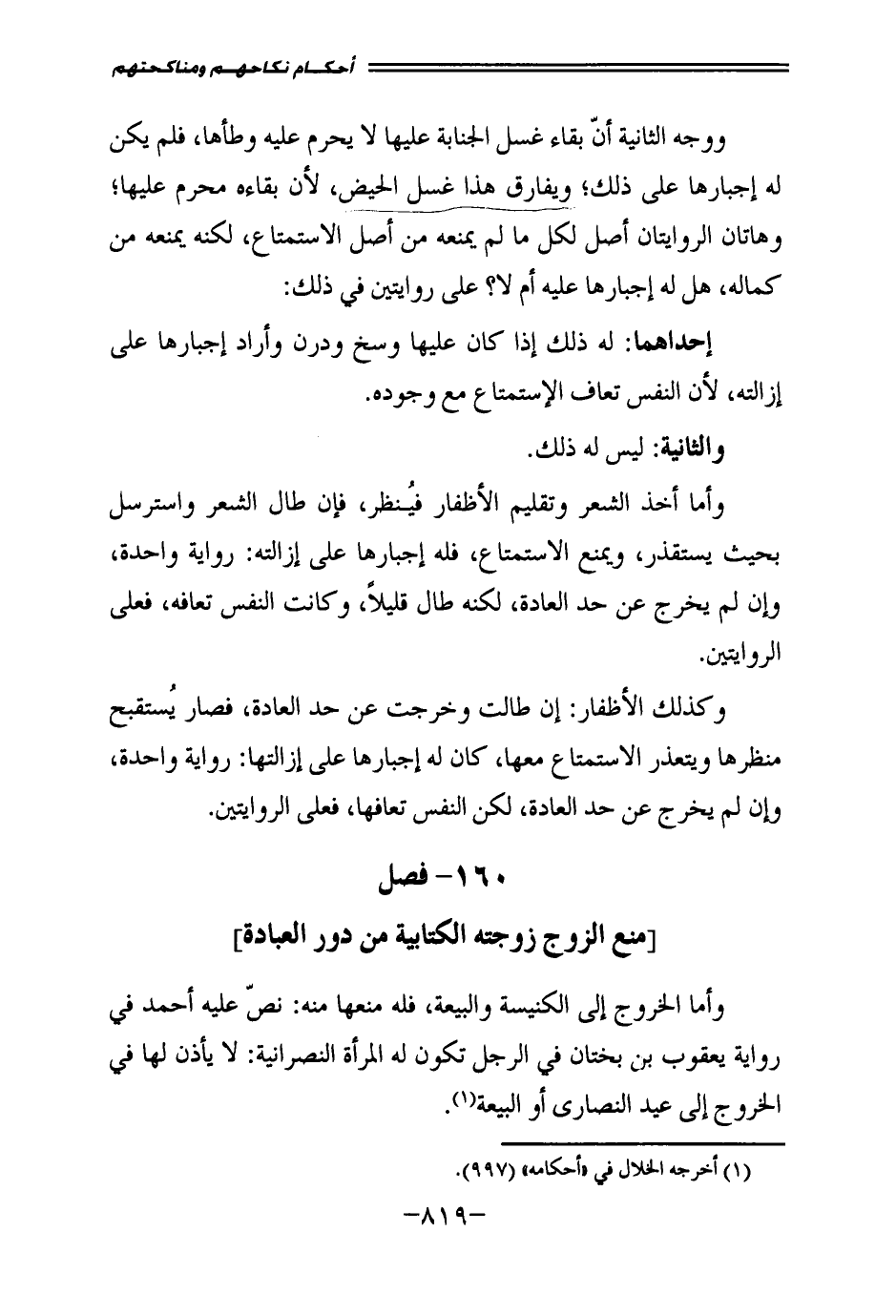 وَوَجْهُ الثَّانِيَةِ أَنَّ بَقَاءَ غُسْلِ الْجَنَابَةِ عَلَيْهَا لَا يُحَرِّمُ عَلَيْهِ وَطْأَهَا، فَلَمْ يَكُنْ لَهُ إِجْبَارُهَا عَلَى ذَلِكَ، وَيُفَارِقُ هَذَا غُسْلُ الْحَيْضِ؛ لِأَنَّ بَقَاءَهُ مُحَرَّمٌ عَلَيْهَا، وَهَاتَانِ الرِّوَايَتَانِ أَصْلٌ لِكُلِّ مَا لَمْ يَمْنَعْهُ مِنْ أَصْلِ الِاسْتِمْتَاعِ، لَكِنَّهُ يَمْنَعُهُ مِنْ كَمَالِهِ، هَلْ لَهُ إِجْبَارُهَا عَلَيْهِ أَمْ لَا؟ عَلَى رِوَايَتَيْنِ فِي ذَلِكَ:
