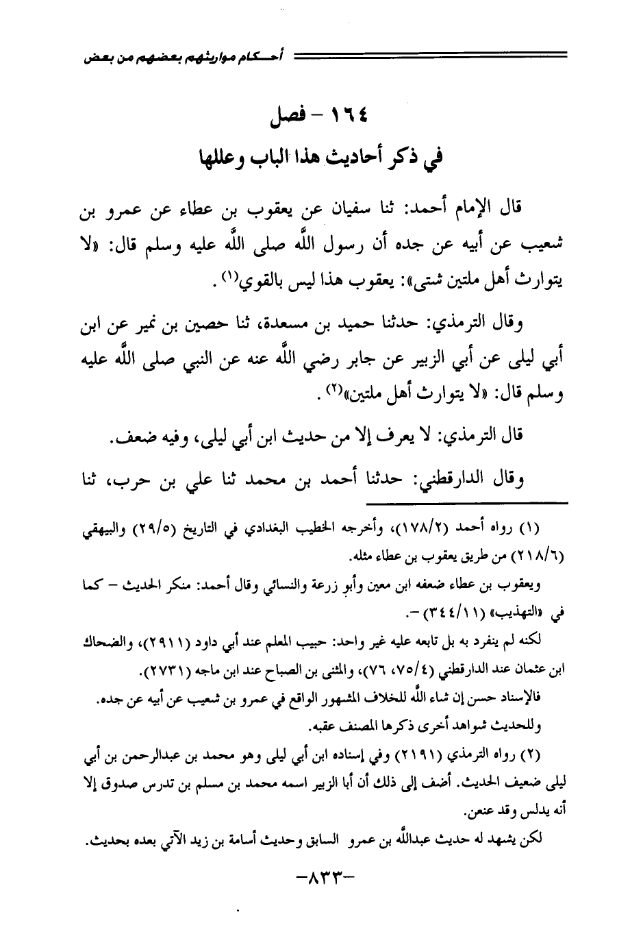 وَقَالَ التِّرْمِذِيُّ: حَدَّثَنَا حُمَيْدُ بْنُ مَسْعَدَةَ، ثَنَا حُصَيْنُ بْنُ نُمَيْرٍ، عَنِ ابْنِ أَبِي لَيْلَى، عَنْ أَبِي الزُّبَيْرِ، عَنْ جَابِرٍ - رَضِيَ اللَّهُ عَنْهُ - عَنِ النَّبِيِّ - صَلَّى اللَّهُ عَلَيْهِ وَسَلَّمَ - قَالَ: " «لَا يَتَوَارَثُ أَهْلُ مِلَّتَيْنِ» ".