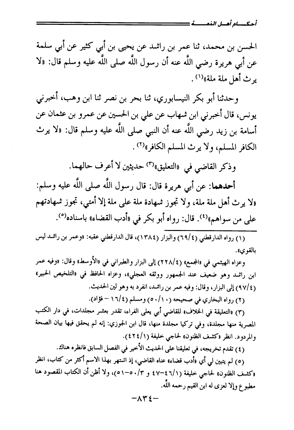 أَحَدُهُمَا: عَنْ أَبِي هُرَيْرَةَ قَالَ: قَالَ رَسُولُ اللَّهِ - صَلَّى اللَّهُ عَلَيْهِ وَسَلَّمَ -: " «لَا يَرِثُ أَهْلُ مِلَّةٍ مِلَّةً، وَلَا تَجُوزُ شَهَادَةُ مِلَّةٍ عَلَى مِلَّةٍ إِلَّا أُمَّتِي، تَجُوزُ شَهَادَتُهُمْ عَلَى مَنْ سِوَاهُمْ» "، قَالَ: رَوَاهُ أَبُو بَكْرٍ فِي " أَدَبِ الْقَضَاءِ " بِإِسْنَادِهِ.