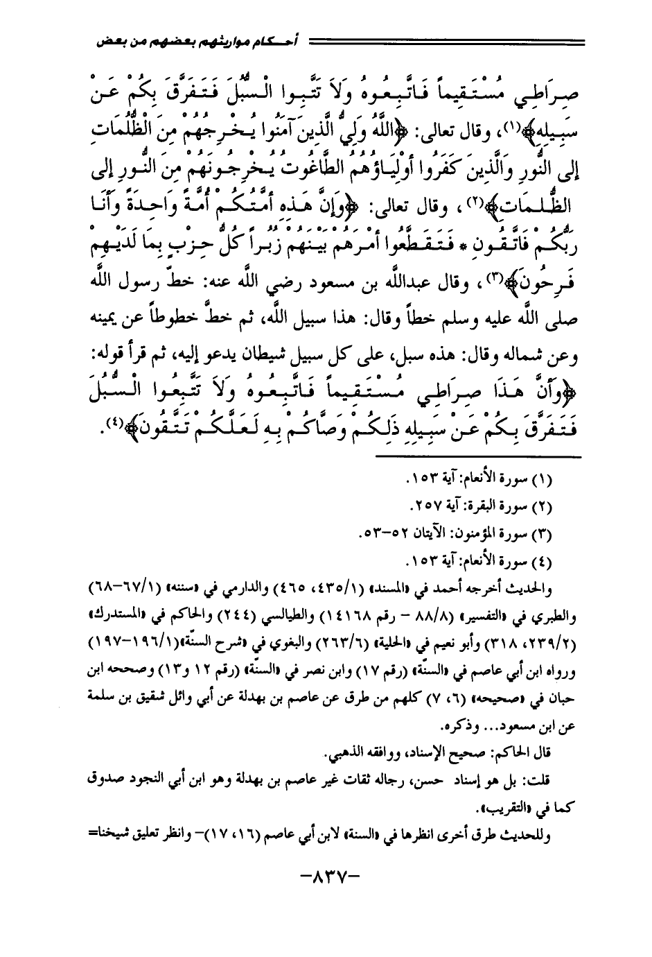 {وَأَنَّ هَذَا صِرَاطِي مُسْتَقِيمًا فَاتَّبِعُوهُ وَلَا تَتَّبِعُوا السُّبُلَ فَتَفَرَّقَ بِكُمْ عَنْ سَبِيلِهِ} [الأنعام: 153] ، وَقَالَ تَعَالَى: {اللَّهُ وَلِيُّ الَّذِينَ آمَنُوا يُخْرِجُهُمْ مِنَ الظُّلُمَاتِ إِلَى النُّورِ وَالَّذِينَ كَفَرُوا أَوْلِيَاؤُهُمُ الطَّاغُوتُ يُخْرِجُونَهُمْ مِنَ النُّورِ إِلَى الظُّلُمَاتِ} [البقرة: 257] ، وَقَالَ تَعَالَى: {وَإِنَّ هَذِهِ أُمَّتُكُمْ أُمَّةً وَاحِدَةً وَأَنَا رَبُّكُمْ فَاتَّقُونِ - فَتَقَطَّعُوا أَمْرَهُمْ بَيْنَهُمْ زُبُرًا كُلُّ حِزْبٍ بِمَا لَدَيْهِمْ فَرِحُونَ} [المؤمنون: 52 - 53] ، وَقَالَ عَبْدُ اللَّهِ بْنُ مَسْعُودٍ - رَضِيَ اللَّهُ عَنْهُ -: «خَطَّ رَسُولُ اللَّهِ - صَلَّى اللَّهُ عَلَيْهِ وَسَلَّمَ - خَطًّا، وَقَالَ: هَذَا سَبِيلُ اللَّهِ، ثُمَّ خَطَّ خُطُوطًا عَنْ يَمِينِهِ وَعَنْ شِمَالِهِ، وَقَالَ: هَذِهِ سُبُلٌ، عَلَى كُلِّ سَبِيلٍ شَيْطَانٌ يَدْعُو إِلَيْهِ، ثُمَّ قَرَأَ قَوْلَهُ: {وَأَنَّ هَذَا صِرَاطِي مُسْتَقِيمًا فَاتَّبِعُوهُ وَلَا تَتَّبِعُوا السُّبُلَ فَتَفَرَّقَ بِكُمْ عَنْ سَبِيلِهِ ذَلِكُمْ وَصَّاكُمْ بِهِ لَعَلَّكُمْ تَتَّقُونَ} [الأنعام: 153] » .