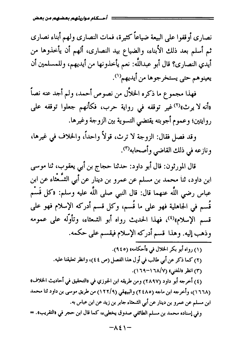قَالَ الْمُوَرِّثُونَ: قَالَ أَبُو دَاوُدَ: حَدَّثَنَا حَجَّاجُ بْنُ أَبِي يَعْقُوبَ، ثَنَا مُوسَى بْنُ دَاوُدَ، ثَنَا مُحَمَّدُ بْنُ مُسْلِمٍ، عَنْ عَمْرِو بْنِ دِينَارٍ، عَنْ أَبِي الشَّعْثَاءِ، عَنِ ابْنِ عَبَّاسٍ - رَضِيَ اللَّهُ عَنْهُمَا - قَالَ: قَالَ النَّبِيُّ - صَلَّى اللَّهُ عَلَيْهِ وَسَلَّمَ -: " «كُلُّ قَسْمٍ قُسِمَ فِي الْجَاهِلِيَّةِ فَهُوَ عَلَى مَا قُسِمَ، وَكُلُّ قَسْمٍ أَدْرَكَهُ الْإِسْلَامُ فَهُوَ عَلَى قَسْمِ الْإِسْلَامِ» "، فَهَذَا الْحَدِيثُ رَوَاهُ أَبُو الشَّعْثَاءِ، وَتَأَوَّلَهُ عَلَى عُمُومِهِ، وَذَهَبَ إِلَيْهِ. وَهَذَا قَسْمٌ أَدْرَكَهُ الْإِسْلَامُ فَيُقْسَمُ عَلَى حُكْمِهِ.