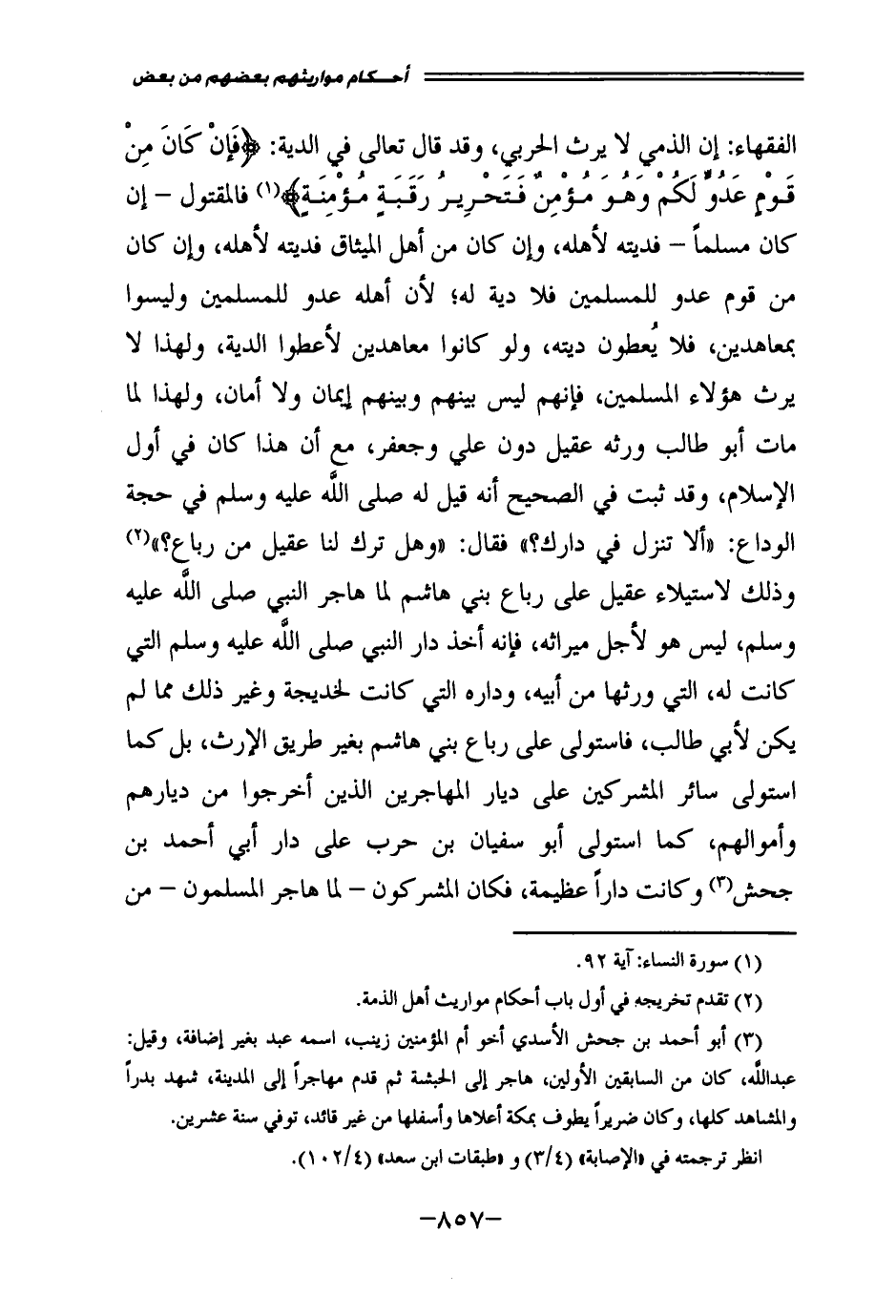 الْفُقَهَاءِ: إِنَّ الذِّمِّيَّ لَا يَرِثُ الْحَرْبِيَّ، وَقَدْ قَالَ تَعَالَى فِي الدِّيَةِ: {فَإِنْ كَانَ مِنْ قَوْمٍ عَدُوٍّ لَكُمْ وَهُوَ مُؤْمِنٌ فَتَحْرِيرُ رَقَبَةٍ مُؤْمِنَةٍ} [النساء: 92] ، فَالْمَقْتُولُ - إِنْ كَانَ مُسْلِمًا - فَدِيَتُهُ لِأَهْلِهِ، وَإِنْ كَانَ مِنْ أَهْلِ الْمِيثَاقِ فَدِيَتُهُ لِأَهْلِهِ، وَإِنْ كَانَ مِنْ قَوْمٍ عَدُوٍّ لِلْمُسْلِمِينَ فَلَا دِيَةَ لَهُ؛ لِأَنَّ أَهْلَهُ عَدُوٌّ لِلْمُسْلِمِينَ وَلَيْسُوا بِمُعَاهَدِينَ، فَلَا يُعْطَوْنَ دِيَتَهُ، وَلَوْ كَانُوا مُعَاهَدِينَ لَأُعْطُوا الدِّيَةَ، وَلِهَذَا لَا يَرِثُ هَؤُلَاءِ الْمُسْلِمِينَ، فَإِنَّهُمْ لَيْسَ بَيْنَهُمْ وَبَيْنَهُمْ إِيمَانٌ وَلَا أَمَانٌ، وَلِهَذَا لَمَّا مَاتَ أَبُو طَالِبٍ وَرِثَهُ عَقِيلٌ دُونَ عَلِيٍّ وَجَعْفَرٍ، مَعَ أَنَّ هَذَا كَانَ فِي أَوَّلِ الْإِسْلَامِ، وَقَدْ ثَبَتَ فِي الصَّحِيحِ أَنَّهُ قِيلَ لَهُ - صَلَّى اللَّهُ عَلَيْهِ وَسَلَّمَ - فِي حَجَّةِ الْوَدَاعِ: " «أَلَا تَنْزِلُ فِي دَارِكَ؟ " فَقَالَ: " وَهَلْ تَرَكَ لَنَا عَقِيلٌ مِنْ رِبَاعٍ» ؟ " وَذَلِكَ لِاسْتِيلَاءِ عَقِيلٍ عَلَى رِبَاعِ بَنِي هَاشِمٍ لَمَّا هَاجَرَ النَّبِيُّ - صَلَّى اللَّهُ عَلَيْهِ وَسَلَّمَ - لَيْسَ هُوَ لِأَجْلِ مِيرَاثِهِ، فَإِنَّهُ أَخَذَ دَارَ النَّبِيِّ - صَلَّى اللَّهُ عَلَيْهِ وَسَلَّمَ - الَّتِي كَانَتْ لَهُ، الَّتِي وَرِثَهَا مِنْ أَبِيهِ، وَدَارَهُ الَّتِي كَانَتْ لِخَدِيجَةَ، وَغَيْرَ ذَلِكَ مِمَّا لَمْ يَكُنْ لِأَبِي طَالِبٍ، فَاسْتَوْلَى عَلَى رِبَاعِ بَنِي هَاشِمٍ بِغَيْرِ طَرِيقِ الْإِرْثِ، بَلْ كَمَا اسْتَوْلَى سَائِرُ الْمُشْرِكِينَ عَلَى دِيَارِ الْمُهَاجِرِينَ الَّذِينَ أُخْرِجُوا مِنْ دِيَارِهِمْ، وَأَمْوَالِهِمْ، كَمَا اسْتَوْلَى أَبُو سُفْيَانَ بْنُ حَرْبٍ عَلَى دَارِ أَبِي أَحْمَدَ بْنِ جَحْشٍ، وَكَانَتْ دَارًا عَظِيمَةً، فَكَانَ الْمُشْرِكُونَ - لَمَّا هَاجَرَ الْمُسْلِمُونَ - مَنْ