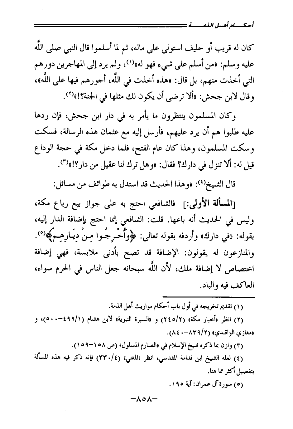 [الْمَسْأَلَةُ الْأُولَى:] فَالشَّافِعِيُّ احْتَجَّ بِهِ عَلَى جَوَازِ بَيْعِ رِبَاعِ مَكَّةَ، وَلَيْسَ فِي الْحَدِيثِ أَنَّهُ بَاعَهَا. قُلْتُ: الشَّافِعِيُّ إِنَّمَا احْتَجَّ بِإِضَافَةِ الدَّارِ إِلَيْهِ، بِقَوْلِهِ " فِي دَارِكَ " وَأَرْدَفَهُ بِقَوْلِهِ تَعَالَى: {وَأُخْرِجُوا مِنْ دِيَارِهِمْ} [آل عمران: 195] ، وَالْمُنَازِعُونَ لَهُ يَقُولُونَ: الْإِضَافَةُ قَدْ تَصِحُّ بِأَدْنَى مُلَابَسَةٍ، فَهِيَ إِضَافَةُ اخْتِصَاصٍ لَا إِضَافَةُ مِلْكٍ؛ لِأَنَّ اللَّهَ سُبْحَانَهُ جَعَلَ النَّاسَ فِي الْحَرَمِ سَوَاءً، الْعَاكِفُ فِيهِ وَالْبَادُ.