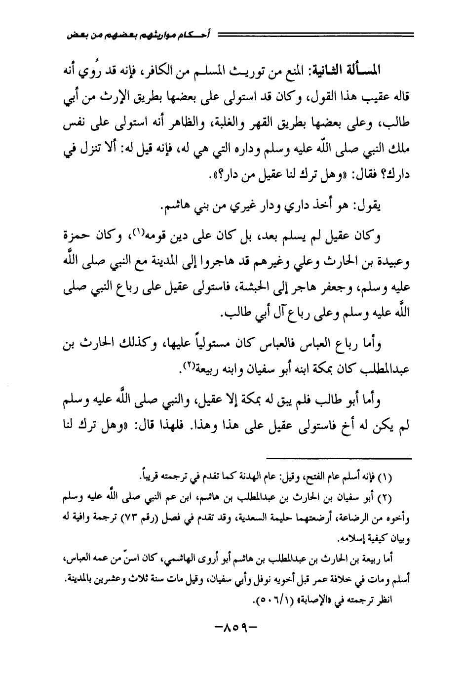 الْمَسْأَلَةُ الثَّانِيَةُ: الْمَنْعُ مِنْ تَوْرِيثِ الْمُسْلِمِ مِنَ الْكَافِرِ، فَإِنَّهُ قَدْ رُوِيَ أَنَّهُ قَالَهُ عَقِيبَ هَذَا الْقَوْلِ، وَكَانَ قَدِ اسْتَوْلَى عَلَى بَعْضِهَا بِطَرِيقِ الْإِرْثِ مِنْ أَبِي طَالِبٍ، وَعَلَى بَعْضِهَا بِطَرِيقِ الْقَهْرِ وَالْغَلَبَةِ، وَالظَّاهِرُ أَنَّهُ اسْتَوْلَى عَلَى نَفْسِ مِلْكِ النَّبِيِّ - صَلَّى اللَّهُ عَلَيْهِ وَسَلَّمَ - وَدَارِهِ الَّتِي هِيَ لَهُ، فَإِنَّهُ قِيلَ لَهُ: «أَلَا تَنْزِلُ فِي دَارِكَ؟ فَقَالَ: " وَهَلْ تَرَكَ لَنَا عَقِيلٌ مِنْ دَارٍ» ؟ "