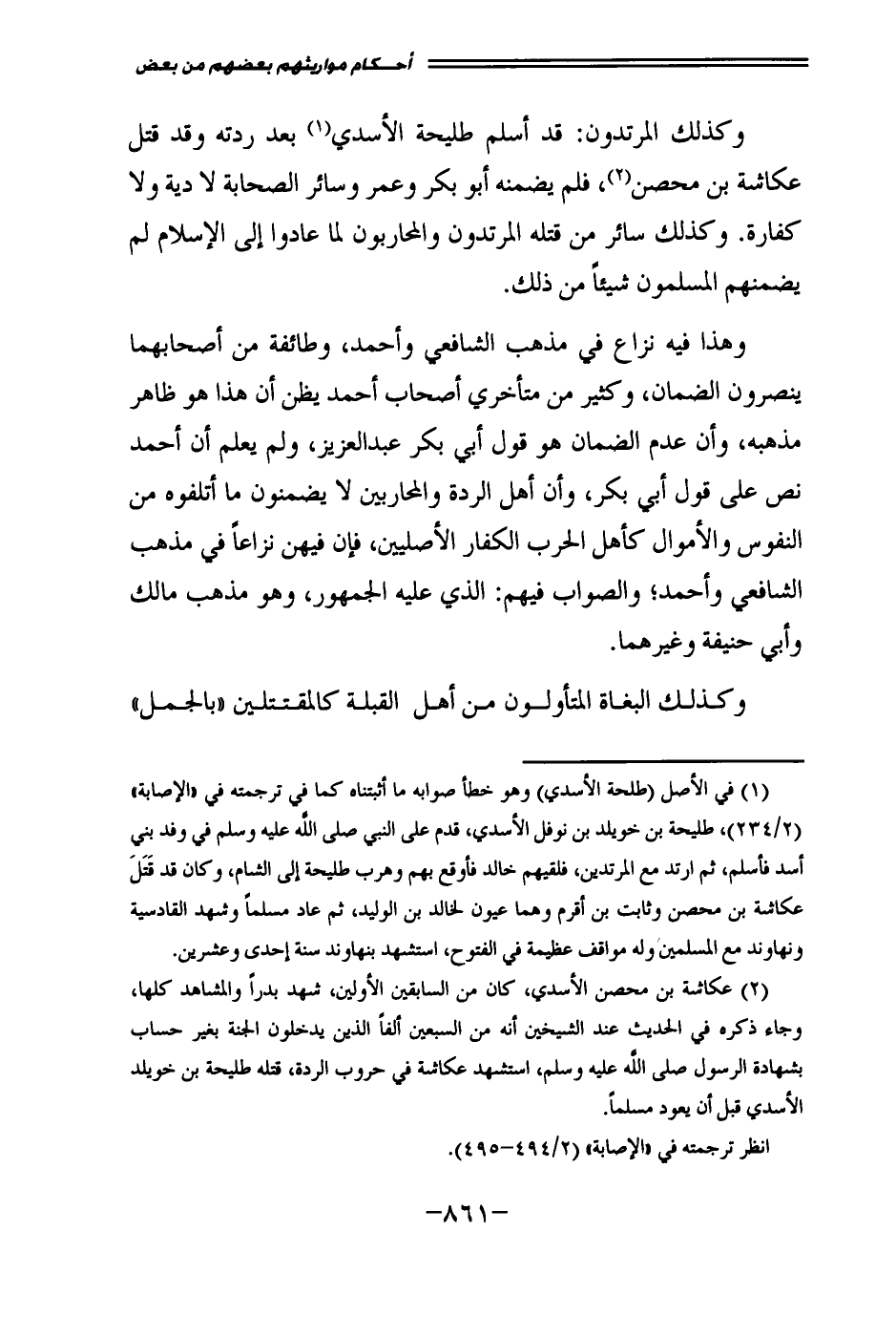 وَكَذَلِكَ الْمُرْتَدُّونَ: قَدْ أَسْلَمَ طُلَيْحَةُ الْأَسَدِيُّ بَعْدَ رِدَّتِهِ، وَقَدْ قَتَلَ عُكَاشَةَ بْنَ مِحْصَنٍ، فَلَمْ يُضَمِّنْهُ أَبُو بَكْرٍ، وَعُمَرُ، وَسَائِرُ الصَّحَابَةِ لَا دِيَةً وَلَا كَفَّارَةً. وَكَذَلِكَ سَائِرُ مَنْ قَتَلَهُ الْمُرْتَدُّونَ، وَالْمُحَارِبُونَ لَمَّا عَادُوا إِلَى الْإِسْلَامِ لَمْ يُضَمِّنْهُمُ الْمُسْلِمُونَ شَيْئًا مِنْ ذَلِكَ.
