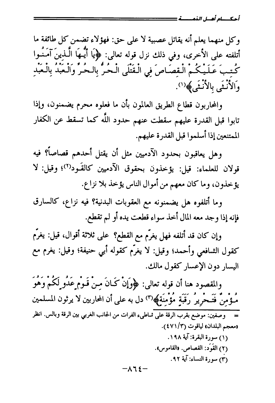 وَكُلٌّ مِنْهُمَا يَعْلَمُ أَنَّهُ يُقَاتِلُ عَصَبِيَّةً لَا عَلَى حَقٍّ: فَهَؤُلَاءِ تَضْمَنُ كُلُّ طَائِفَةٍ مَا أَتْلَفَتْهُ عَلَى الْأُخْرَى، وَفِي ذَلِكَ نَزَلَ قَوْلُهُ تَعَالَى: {يَا أَيُّهَا الَّذِينَ آمَنُوا كُتِبَ عَلَيْكُمُ الْقِصَاصُ فِي الْقَتْلَى الْحُرُّ بِالْحُرِّ وَالْعَبْدُ بِالْعَبْدِ وَالْأُنْثَى بِالْأُنْثَى} [البقرة: 178] .