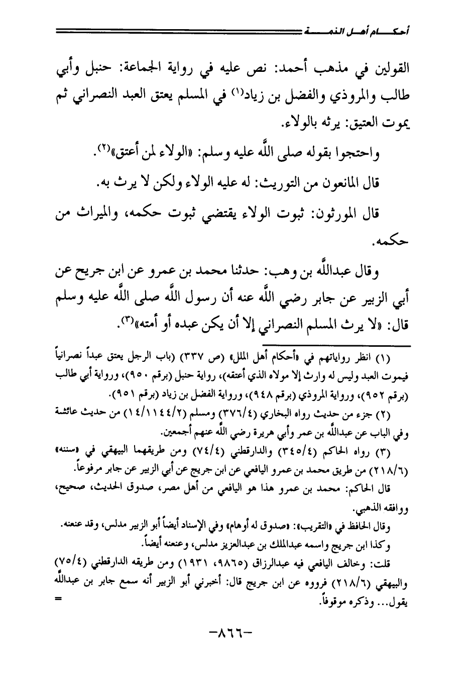 الْقَوْلَيْنِ فِي مَذْهَبِ أَحْمَدَ: نَصَّ عَلَيْهِ فِي رِوَايَةِ الْجَمَاعَةِ: حَنْبَلٌ، وَأَبِي طَالِبٍ، وَالْمَرُّوذِيُّ، وَالْفَضْلُ بْنُ زِيَادٍ فِي الْمُسْلِمِ يُعْتِقُ الْعَبْدَ النَّصْرَانِيَّ، ثُمَّ يَمُوتُ الْعَتِيقُ: يَرِثُهُ بِالْوَلَاءِ.