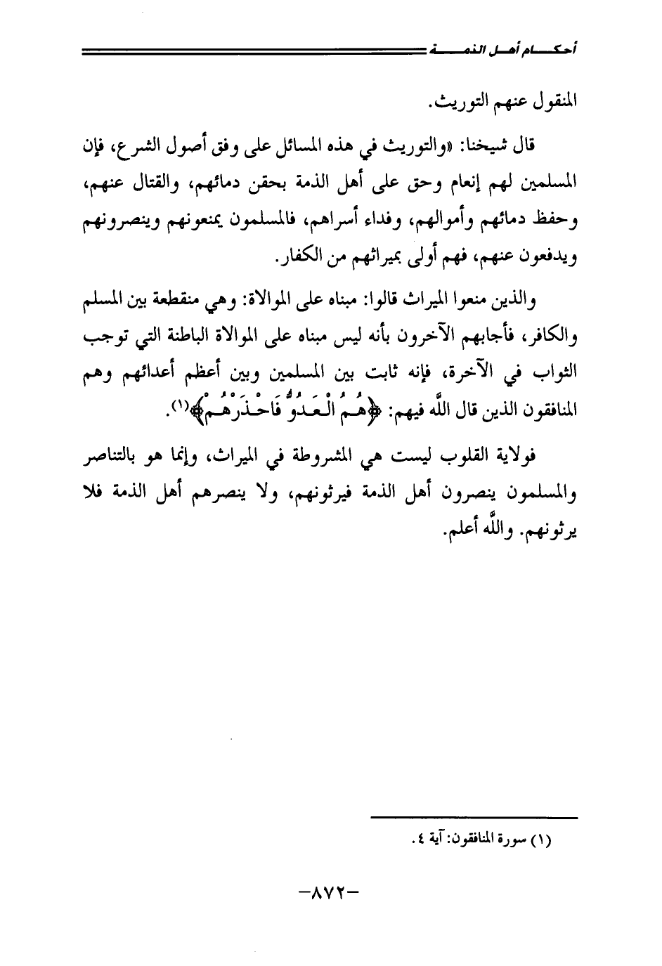 وَالَّذِينَ مَنَعُوا الْمِيرَاثَ قَالُوا: مَبْنَاهُ عَلَى الْمُوَالَاةِ: وَهِيَ مُنْقَطِعَةٌ بَيْنَ الْمُسْلِمِ، وَالْكَافِرِ، فَأَجَابَهُمُ الْآخَرُونَ بِأَنَّهُ لَيْسَ مَبْنَاهُ عَلَى الْمُوَالَاةِ الْبَاطِنَةِ الَّتِي تُوجِبُ الثَّوَابَ فِي الْآخِرَةِ، فَإِنَّهُ ثَابِتٌ بَيْنَ الْمُسْلِمِينَ، وَبَيْنَ أَعْظَمِ أَعْدَائِهِمْ، وَهُمُ الْمُنَافِقُونَ الَّذِينَ قَالَ اللَّهُ فِيهِمْ: {هُمُ الْعَدُوُّ فَاحْذَرْهُمْ} [المنافقون: 4] .