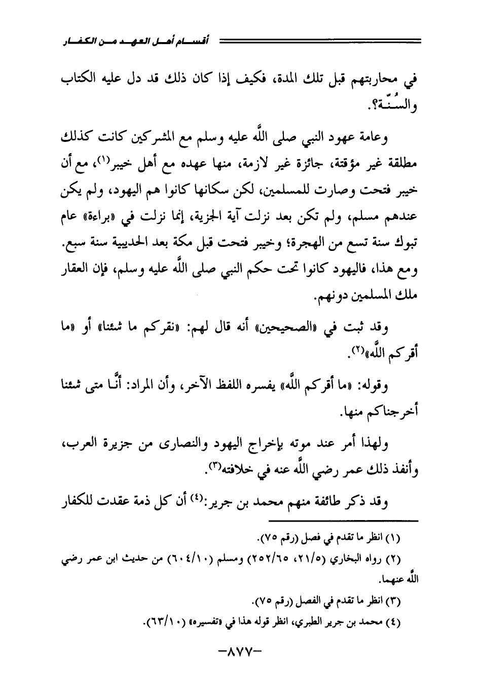 وَعَامَّةُ عُهُودِ النَّبِيِّ - صَلَّى اللَّهُ عَلَيْهِ وَسَلَّمَ - مَعَ الْمُشْرِكِينَ كَانَتْ كَذَلِكَ مُطْلَقَةً غَيْرَ مُؤَقَّتَةٍ، جَائِزَةً غَيْرَ لَازِمَةٍ، مِنْهَا عَهْدُهُ مَعَ أَهْلِ خَيْبَرَ، مَعَ أَنَّ خَيْبَرَ فُتِحَتْ، وَصَارَتْ لِلْمُسْلِمِينَ، لَكِنَّ سُكَّانَهَا كَانُوا هُمُ الْيَهُودَ، وَلَمْ يَكُنْ عِنْدَهُمْ مُسْلِمٌ، وَلَمْ تَكُنْ بَعْدُ نَزَلَتْ آيَةُ الْجِزْيَةِ، إِنَّمَا نَزَلَتْ فِي " بَرَاءَةٌ " عَامَ تَبُوكَ سَنَةَ تِسْعٍ مِنَ الْهِجْرَةِ، وَخَيْبَرُ فُتِحَتْ قَبْلَ مَكَّةَ بَعْدَ الْحُدَيْبِيَةِ سَنَةَ سَبْعٍ. وَمَعَ هَذَا، فَالْيَهُودُ كَانُوا تَحْتَ حُكْمِ النَّبِيِّ - صَلَّى اللَّهُ عَلَيْهِ وَسَلَّمَ - فَإِنَّ الْعَقَارَ مِلْكُ الْمُسْلِمِينَ دُونَهُمْ.