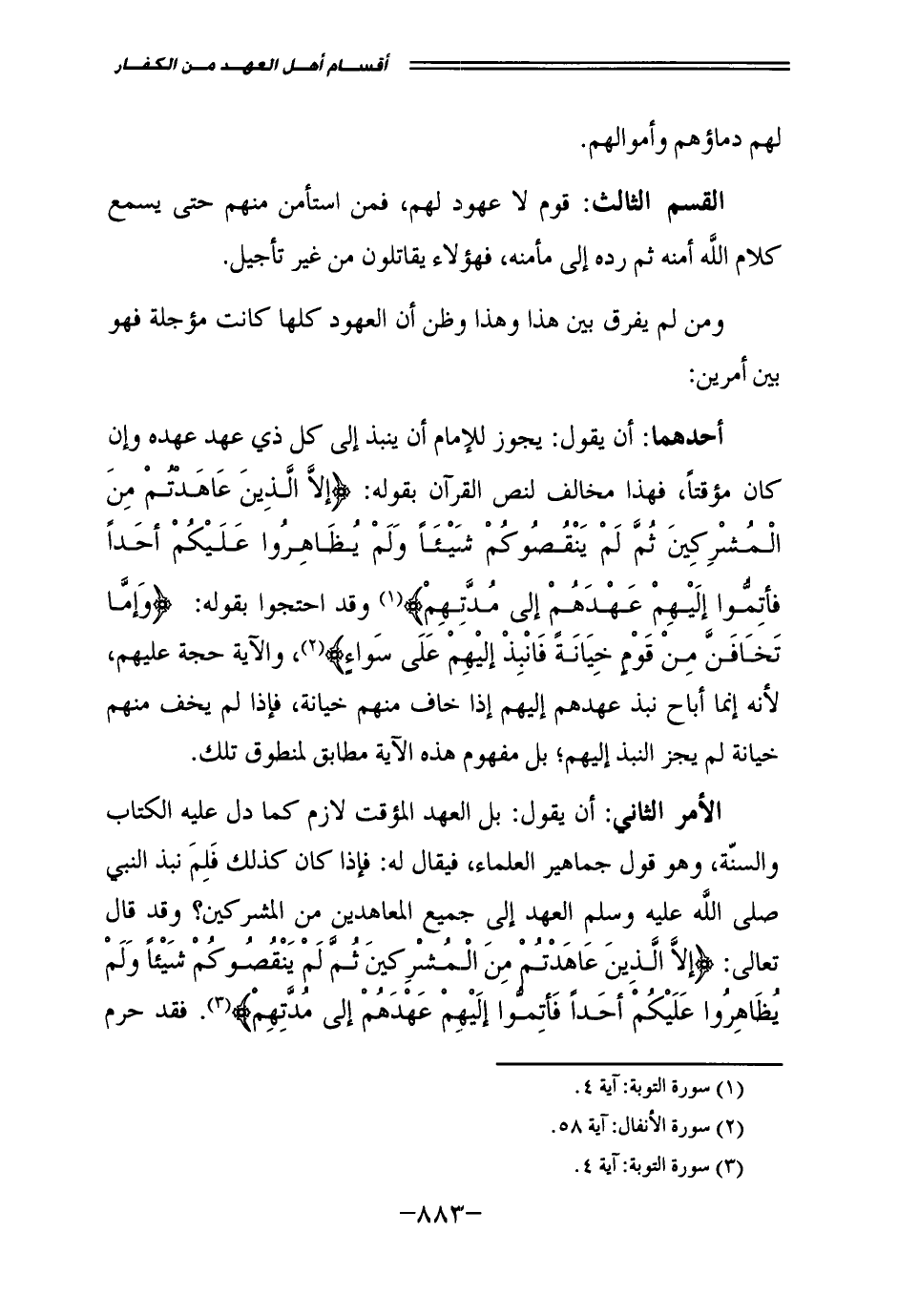 أَحَدُهُمَا: أَنْ يَقُولَ: يَجُوزُ لِلْإِمَامِ أَنْ يَنْبِذَ إِلَى كُلِّ ذِي عَهْدٍ عَهْدَهُ، وَإِنْ كَانَ مُؤَقَّتًا، فَهَذَا مُخَالِفٌ لِنَصِّ الْقُرْآنِ بِقَوْلِهِ: {إِلَّا الَّذِينَ عَاهَدْتُمْ مِنَ الْمُشْرِكِينَ ثُمَّ لَمْ يَنْقُصُوكُمْ شَيْئًا وَلَمْ يُظَاهِرُوا عَلَيْكُمْ أَحَدًا فَأَتِمُّوا إِلَيْهِمْ عَهْدَهُمْ إِلَى مُدَّتِهِمْ} [التوبة: 4] ، وَقَدِ احْتَجُّوا بِقَوْلِهِ: {وَإِمَّا تَخَافَنَّ مِنْ قَوْمٍ خِيَانَةً فَانْبِذْ إِلَيْهِمْ عَلَى سَوَاءٍ} [الأنفال: 58] ، وَالْآيَةُ حُجَّةٌ عَلَيْهِمْ؛ لِأَنَّهُ إِنَّمَا أَبَاحَ نَبْذَ عَهْدِهِمْ إِلَيْهِمْ إِذَا خَافَ مِنْهُمْ خِيَانَةً، فَإِذَا لَمْ يَخَفْ مِنْهُمْ خِيَانَةً لَمْ يَجُزِ النُّبَذُ إِلَيْهِمْ، بَلْ مَفْهُومُ هَذِهِ الْآيَةِ مُطَابِقٌ لِمَنْطُوقِ تِلْكَ.