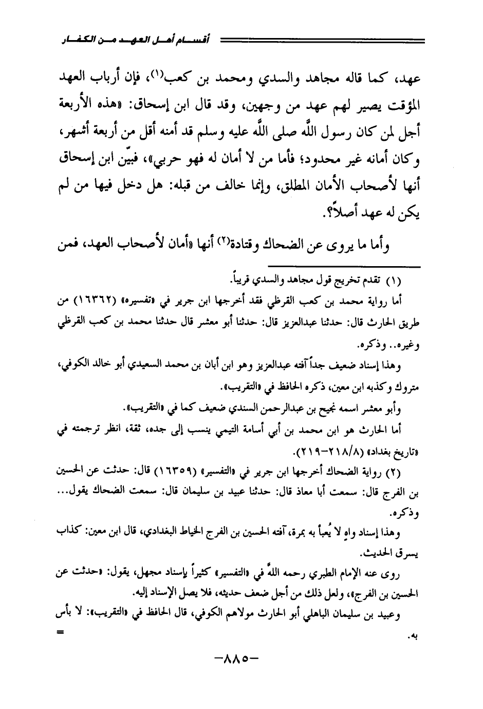 وَأَمَّا مَا يُرْوَى عَنِ الضَّحَّاكِ، وَقَتَادَةَ أَنَّهَا " أَمَانٌ لِأَصْحَابِ الْعَهْدِ، فَمَنْ
