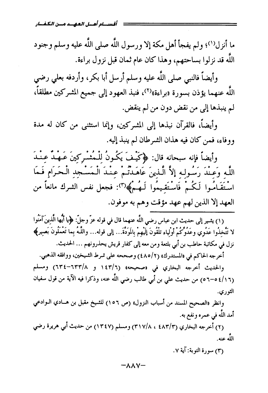 وَأَيْضًا، فَإِنَّهُ سُبْحَانَهُ قَالَ: {كَيْفَ يَكُونُ لِلْمُشْرِكِينَ عَهْدٌ عِنْدَ اللَّهِ وَعِنْدَ رَسُولِهِ إِلَّا الَّذِينَ عَاهَدْتُمْ عِنْدَ الْمَسْجِدِ الْحَرَامِ فَمَا اسْتَقَامُوا لَكُمْ فَاسْتَقِيمُوا لَهُمْ} [التوبة: 7] ، فَجَعَلَ نَفْسَ الشِّرْكِ مَانِعًا مِنَ الْعَهْدِ إِلَّا الَّذِينَ لَهُمْ عَهْدٌ مُؤَقَّتٌ وَهُمْ بِهِ مُوفُونَ.