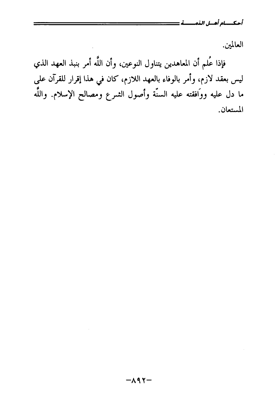 فَإِذَا عُلِمَ أَنَّ الْمُعَاهَدِينَ يَتَنَاوَلُ النَّوْعَيْنِ، وَأَنَّ اللَّهَ أَمَرَ بِنَبْذِ الْعَهْدِ الَّذِي لَيْسَ بِعَقْدٍ لَازِمٍ، وَأَمَرَ بِالْوَفَاءِ بِالْعَهْدِ اللَّازِمِ، كَانَ فِي هَذَا إِقْرَارٌ لِلْقُرْآنِ عَلَى مَا دَلَّ عَلَيْهِ، وَوَافَقَتْهُ عَلَيْهِ السُّنَّةُ وَأُصُولُ الشَّرْعِ، وَمَصَالِحُ الْإِسْلَامِ، وَاللَّهُ الْمُسْتَعَانُ.