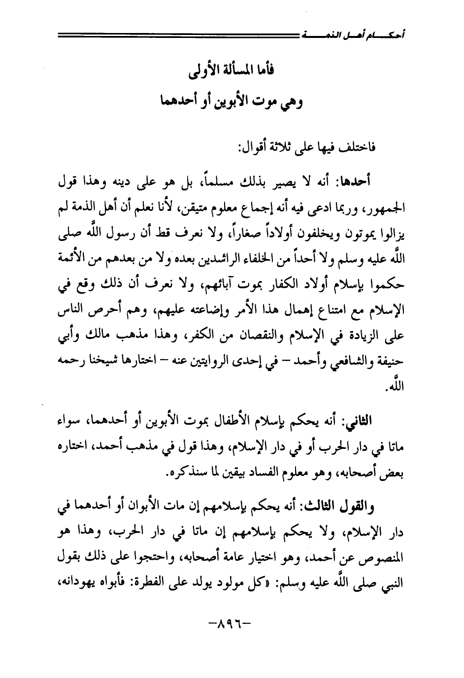 أَحَدُهَا: أَنَّهُ لَا يَصِيرُ بِذَلِكَ مُسْلِمًا، بَلْ هُوَ عَلَى دِينِهِ، وَهَذَا قَوْلُ الْجُمْهُورِ، وَرُبَّمَا ادَّعَى فِيهِ أَنَّهُ إِجْمَاعٌ مَعْلُومٌ مُتَيَقَّنٌ، لِأَنَّا نَعْلَمُ أَنَّ أَهْلَ الذِّمَّةِ لَمْ يَزَالُوا يَمُوتُونَ، وَيُخَلِّفُونَ أَوْلَادًا صِغَارًا، وَلَا نَعْرِفُ قَطُّ أَنَّ رَسُولَ اللَّهِ - صَلَّى اللَّهُ عَلَيْهِ وَسَلَّمَ - وَلَا أَحَدًا مِنَ الْخُلَفَاءِ الرَّاشِدِينَ بَعْدَهُ، وَلَا مَنْ بَعْدَهُمْ مِنَ الْأَئِمَّةِ حَكَمُوا بِإِسْلَامِ أَوْلَادِ الْكُفَّارِ بِمَوْتِ آبَائِهِمْ، وَلَا نَعْرِفُ أَنَّ ذَلِكَ وَقَعَ فِي الْإِسْلَامِ مَعَ امْتِنَاعِ إِهْمَالِ هَذَا الْأَمْرِ، وَإِضَاعَتِهِ عَلَيْهِمْ، وَهُمْ أَحْرَصُ النَّاسِ عَلَى الزِّيَادَةِ فِي الْإِسْلَامِ وَالنُّقْصَانِ مِنَ الْكُفْرِ، وَهَذَا مَذْهَبُ مَالِكٍ، وَأَبِي حَنِيفَةَ، وَالشَّافِعِيِّ، وَأَحْمَدَ - فِي إِحْدَى الرِّوَايَتَيْنِ عَنْهُ - اخْتَارَهَا شَيْخُنَا، رَحِمَهُ اللَّهُ.